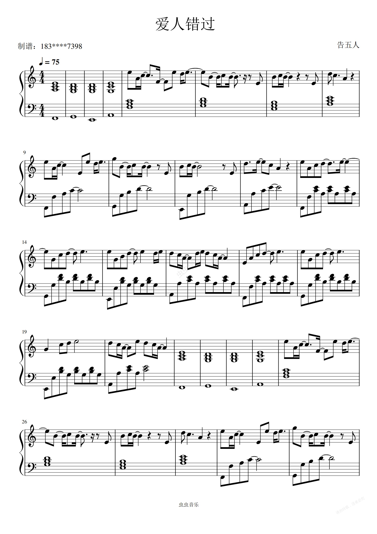 钢琴谱:《爱人错过》--(性价比超高)--C调