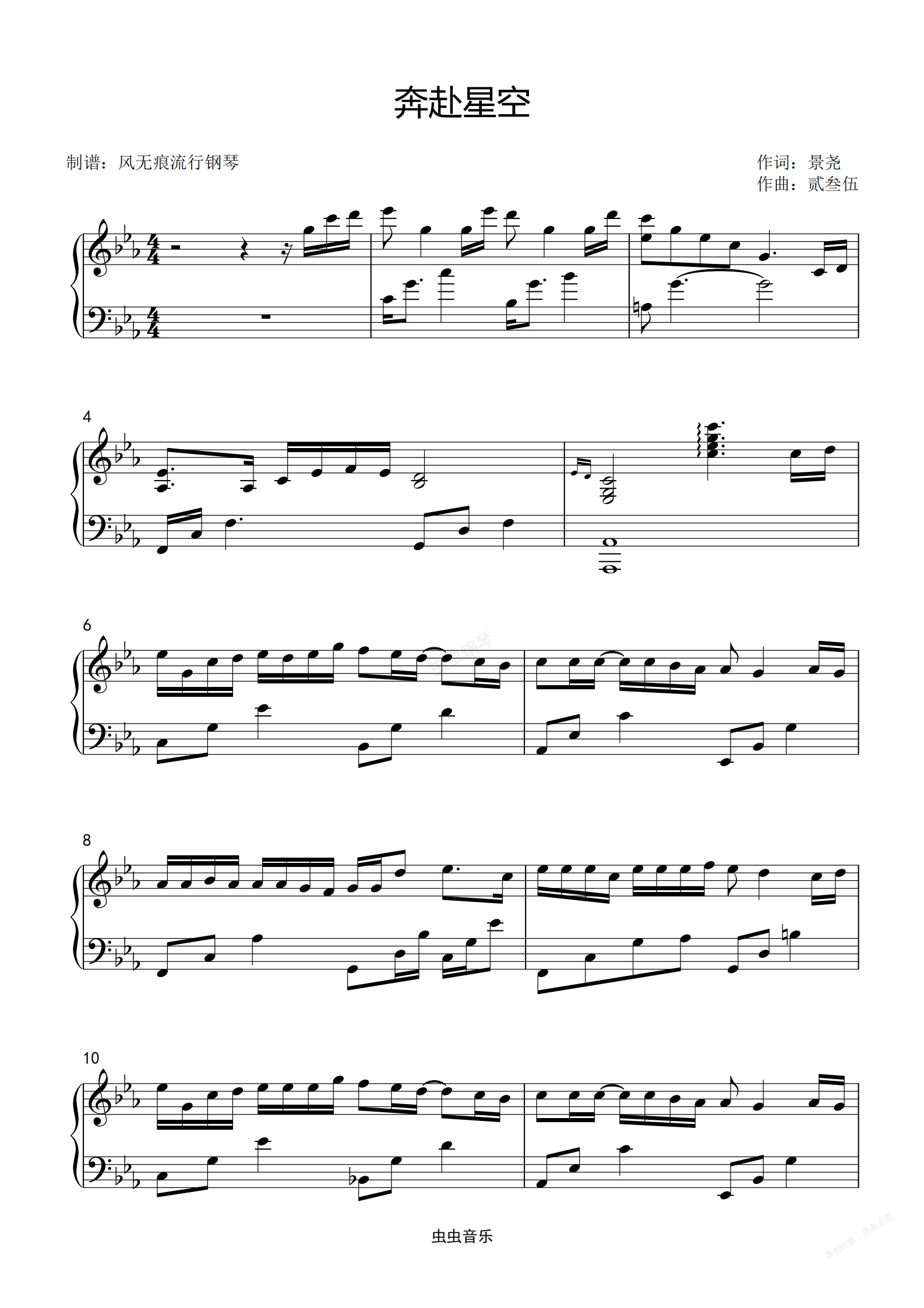 钢琴谱:原调-奔赴星空-尹昔眠〖简易动听〗