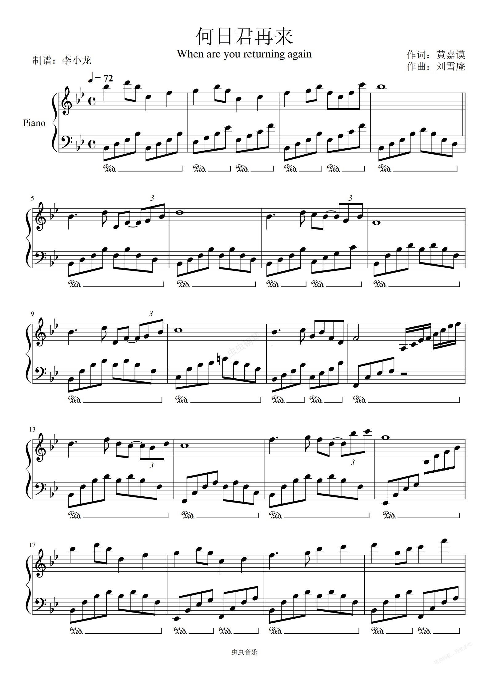 钢琴谱:理查德克莱德曼-《何日君再来》When are you returning again