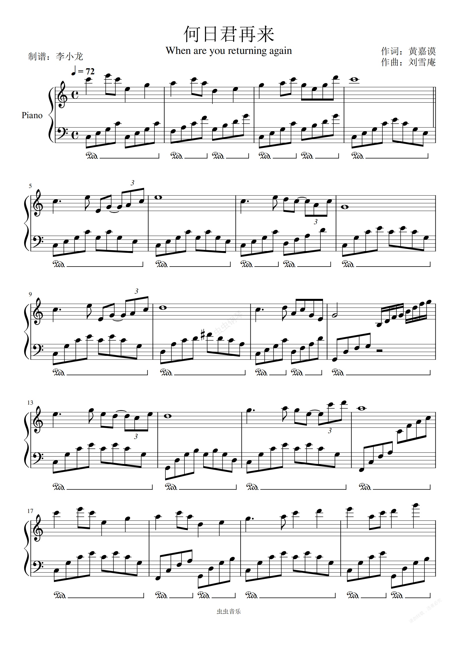 钢琴谱:理查德克莱德曼-《何日君再来》When are you returning again