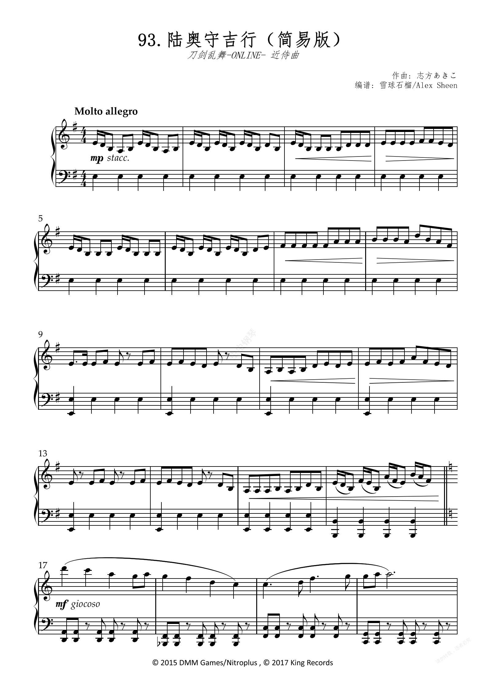 钢琴谱:陆奥守吉行 近侍曲 【刀剑乱舞】(简易版)