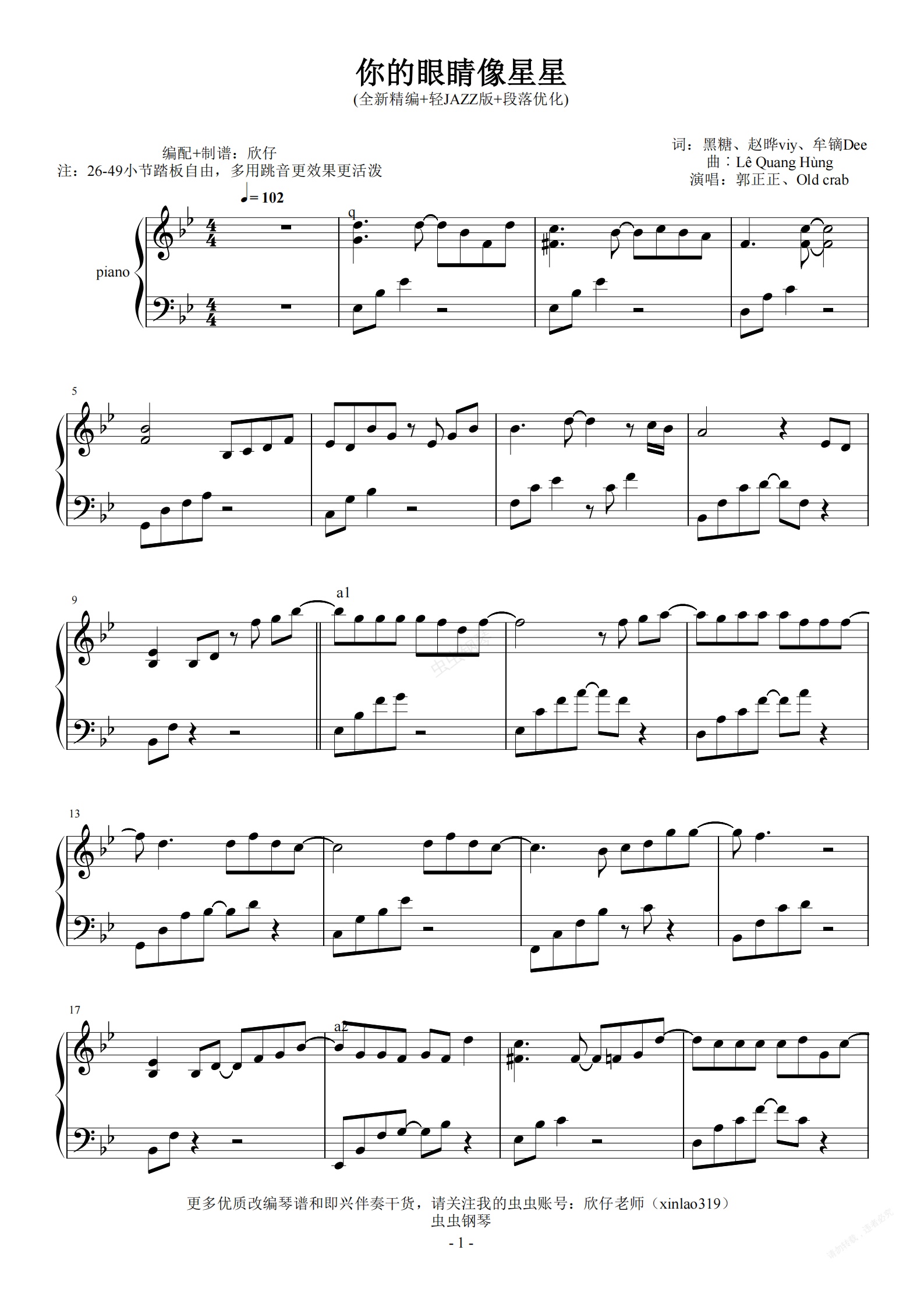 钢琴谱:降B调《你的眼睛像星星》(全新精编+轻JAZZ版+段落优化)