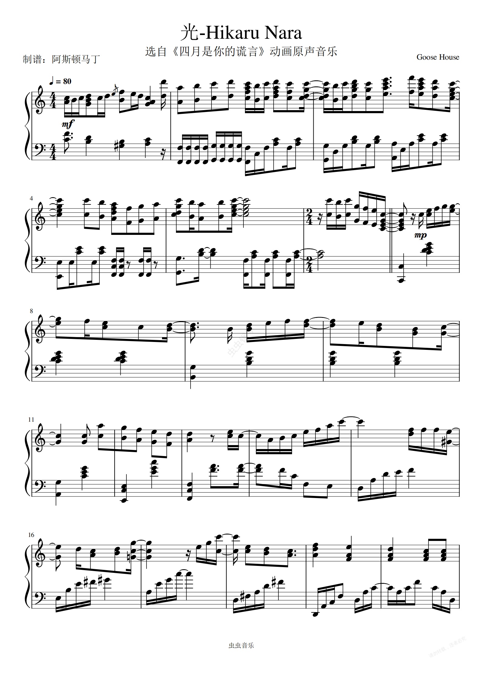 钢琴谱:《四月是你的谎言》-光-Hikaru Nara