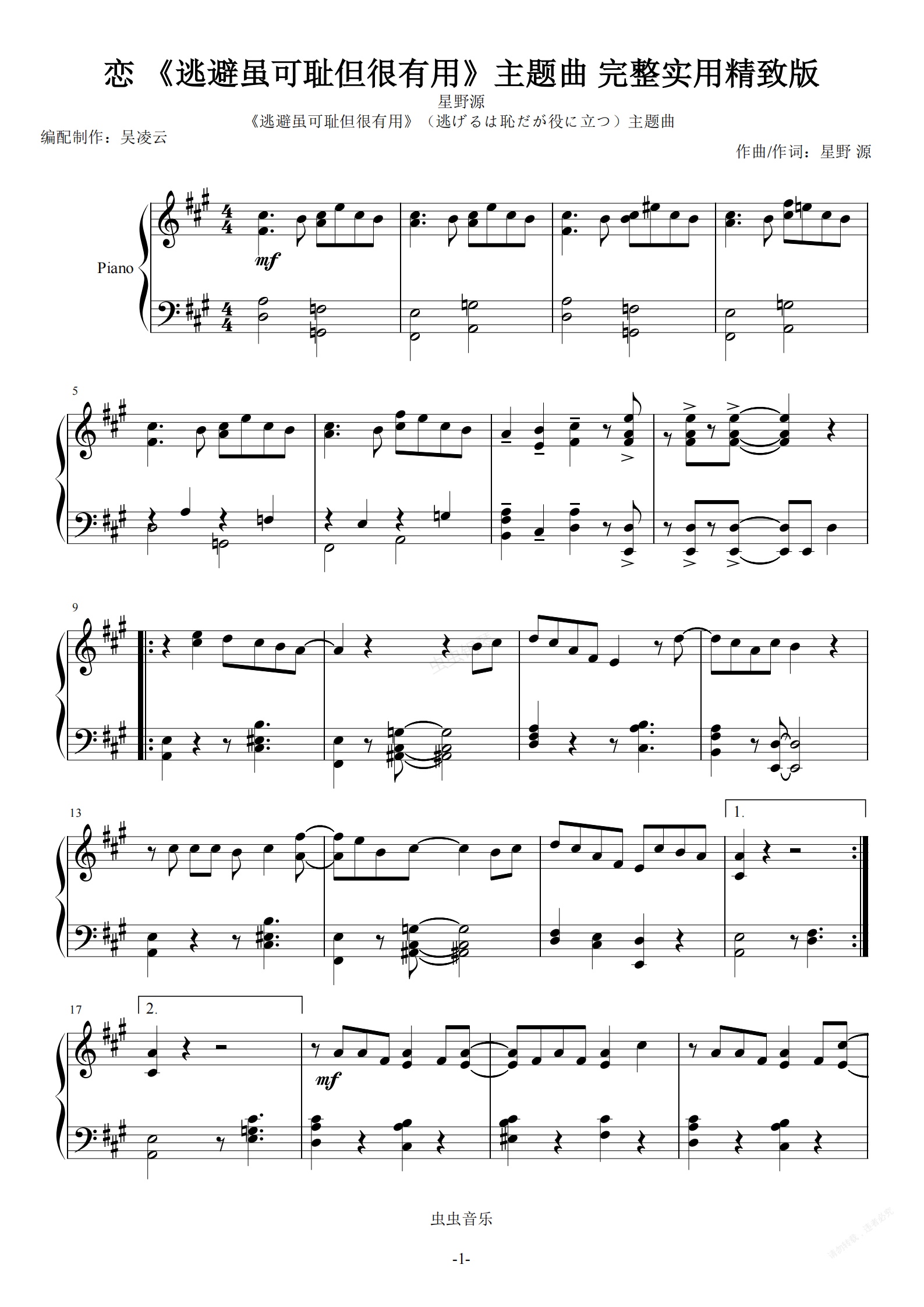 钢琴谱:恋 星野源《逃避虽可耻但很有用》主题曲 完整实用精致版 吴凌云制版