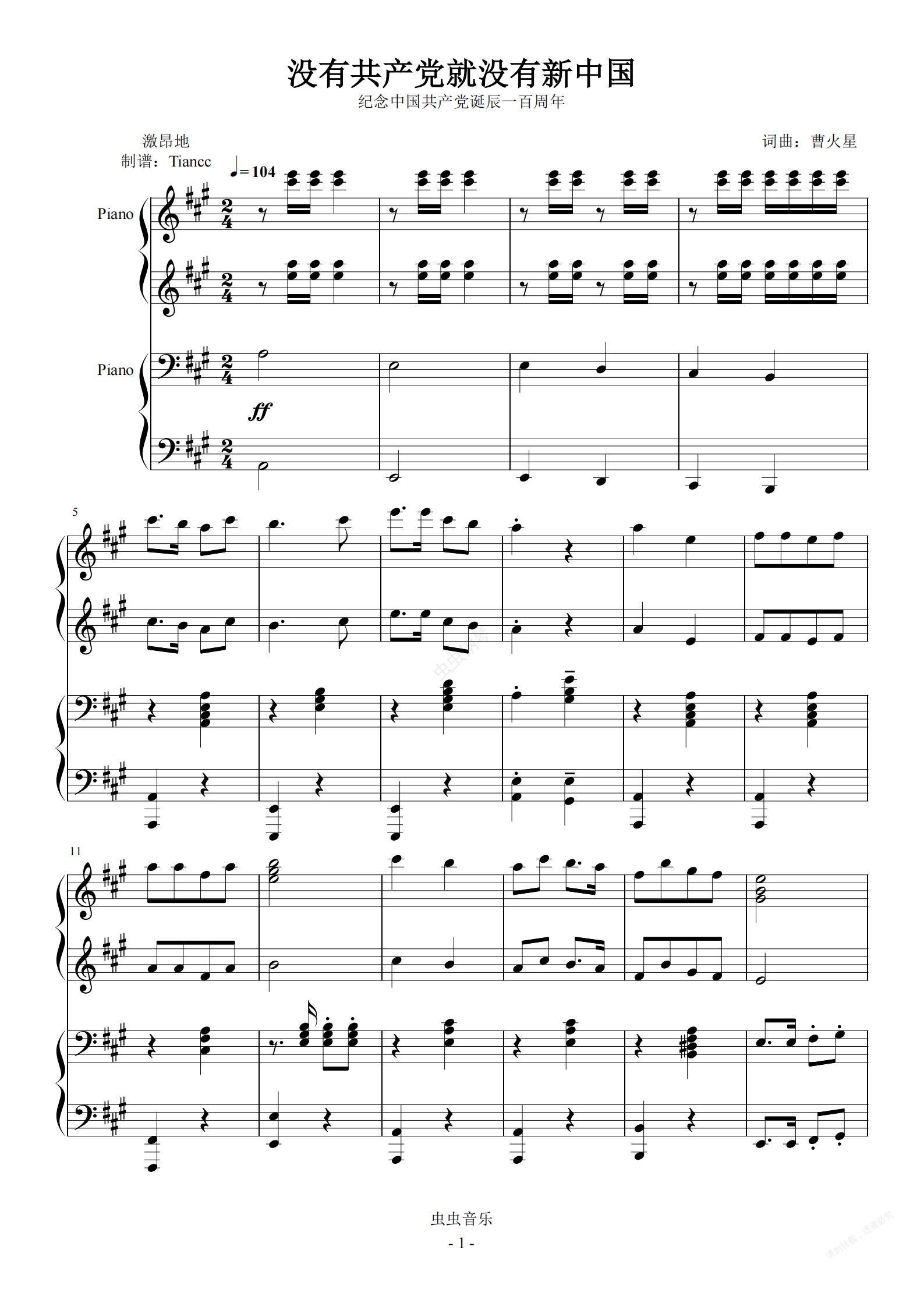 钢琴谱:《没有共产党就没有新中国》四手联弹,大气恢宏演奏版
