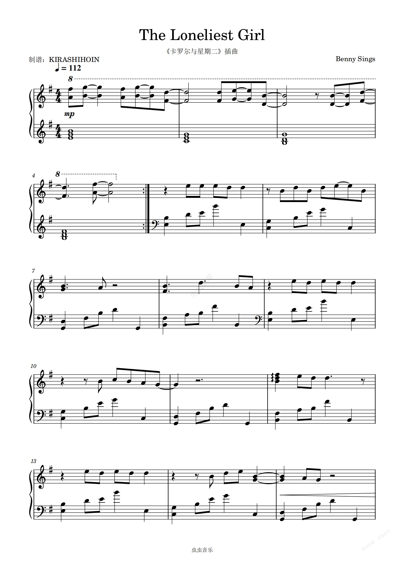 钢琴谱:The Loneliest Girl(《卡罗尔与星期二》插曲)
