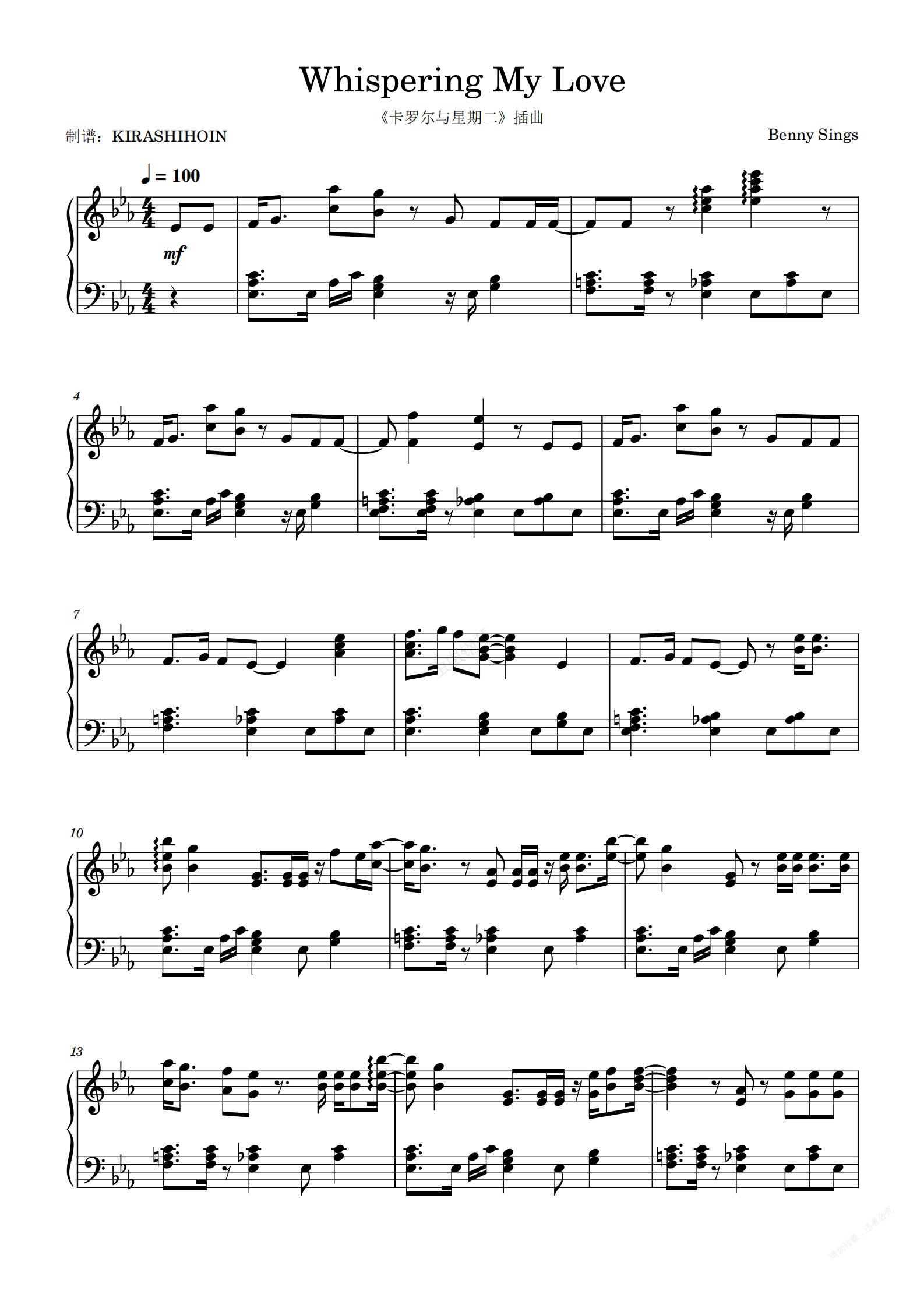 钢琴谱:Whispering My Love(《卡罗尔与星期二》插曲)