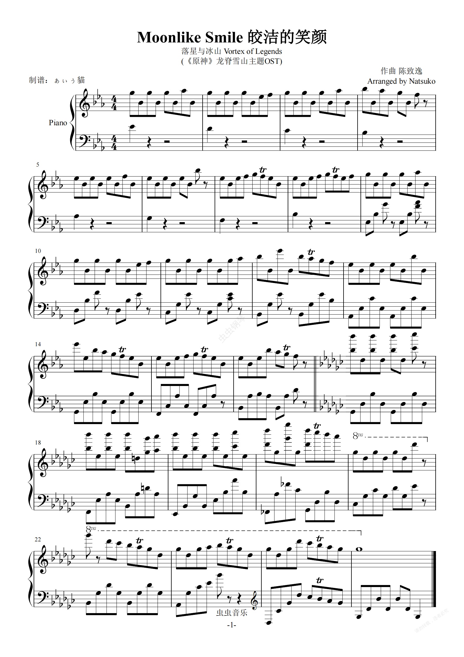钢琴谱:原神-龙脊雪山bgm-Moonlike Smile 皎洁的笑颜