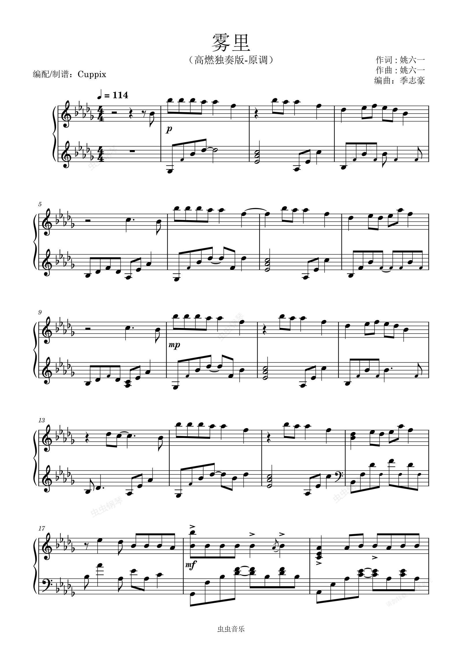 钢琴谱:姚六一《雾里》高燃独奏版-原调