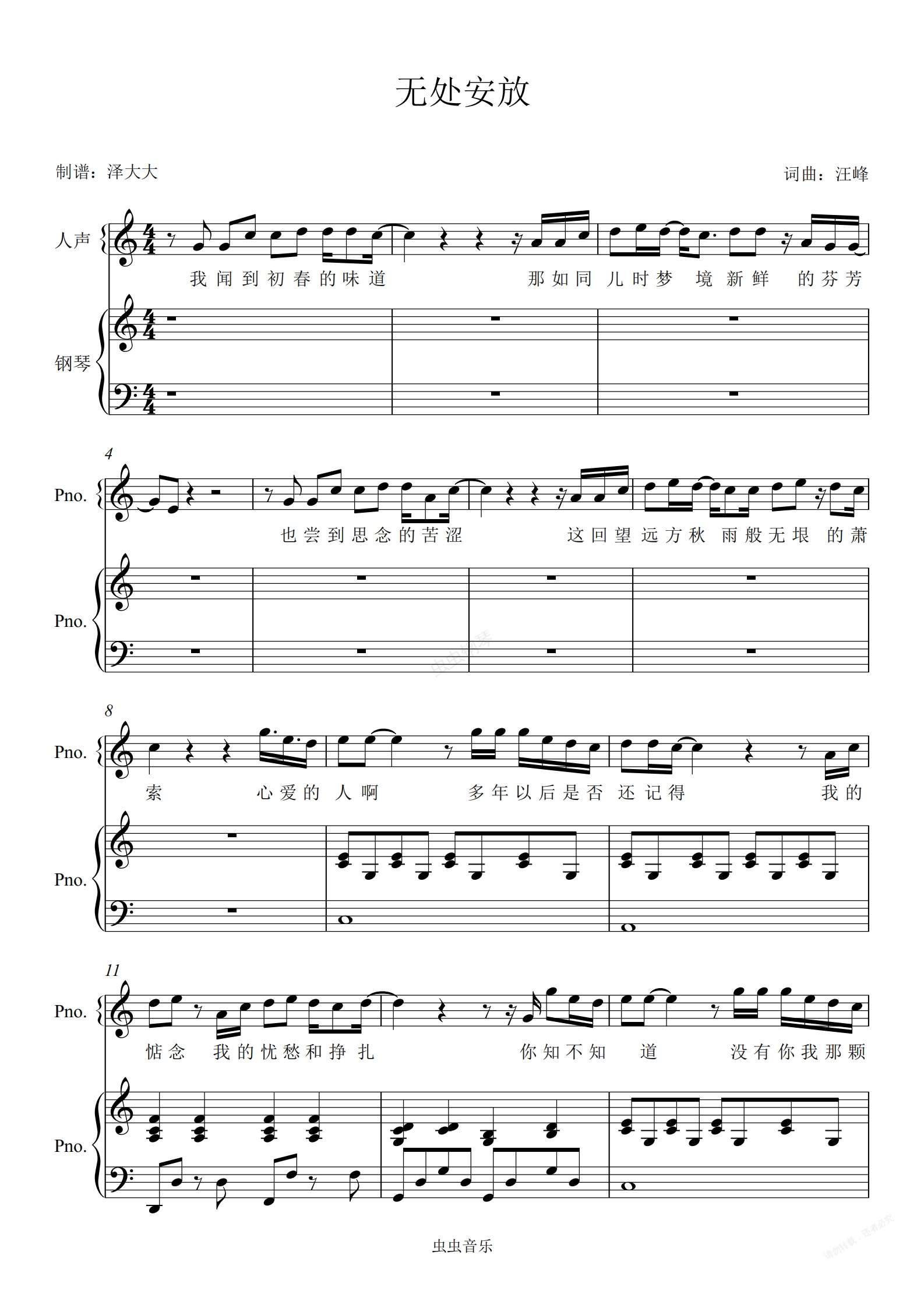 钢琴谱:无处安放【C调完美弹唱附词】泽大大 汪峰