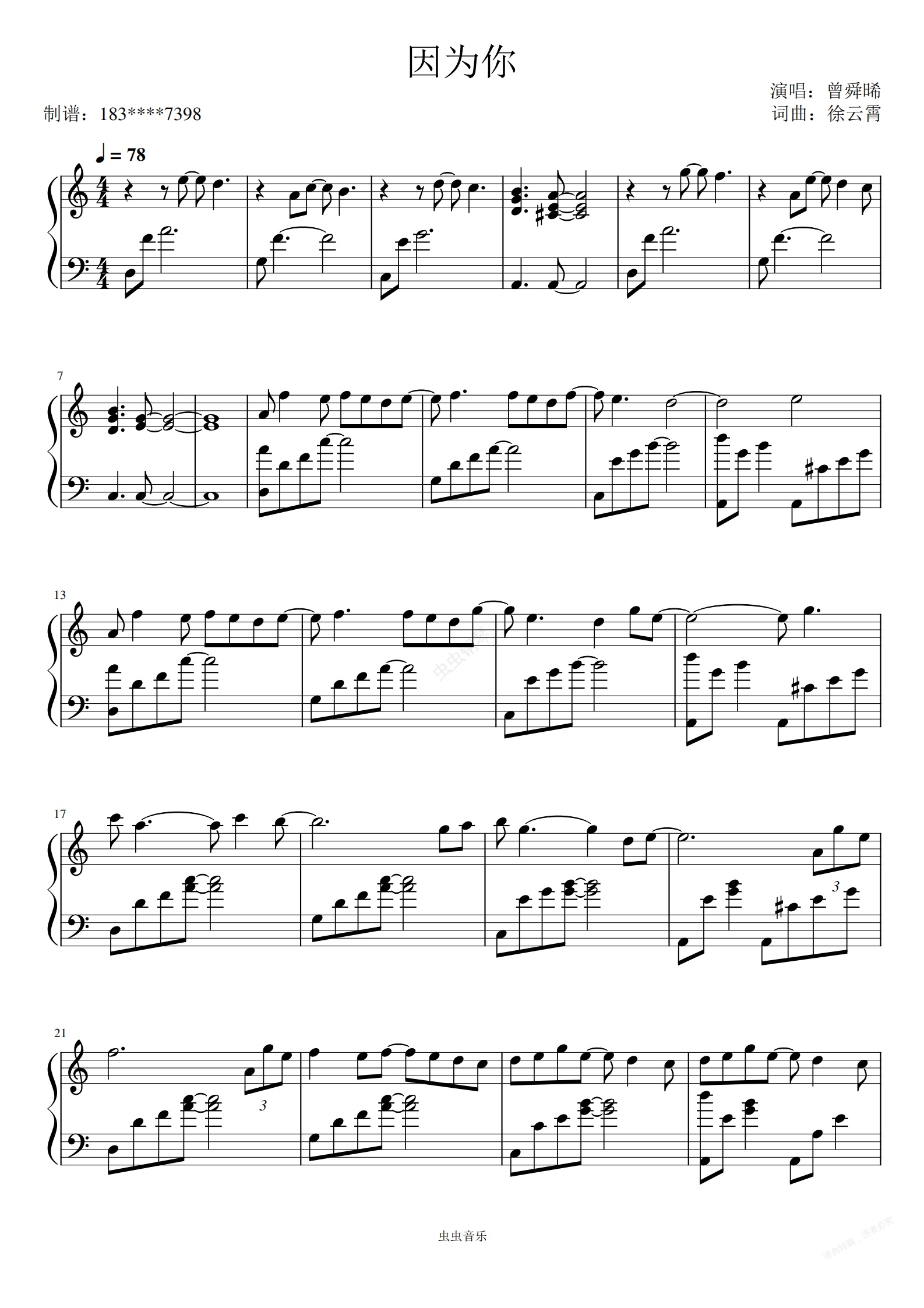 钢琴谱:性价比超高-《因为你》-C调--啊信改编