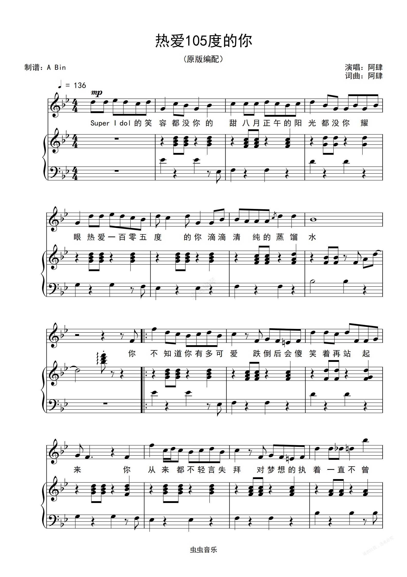 钢琴谱:热爱105度的你(原版弹唱谱)