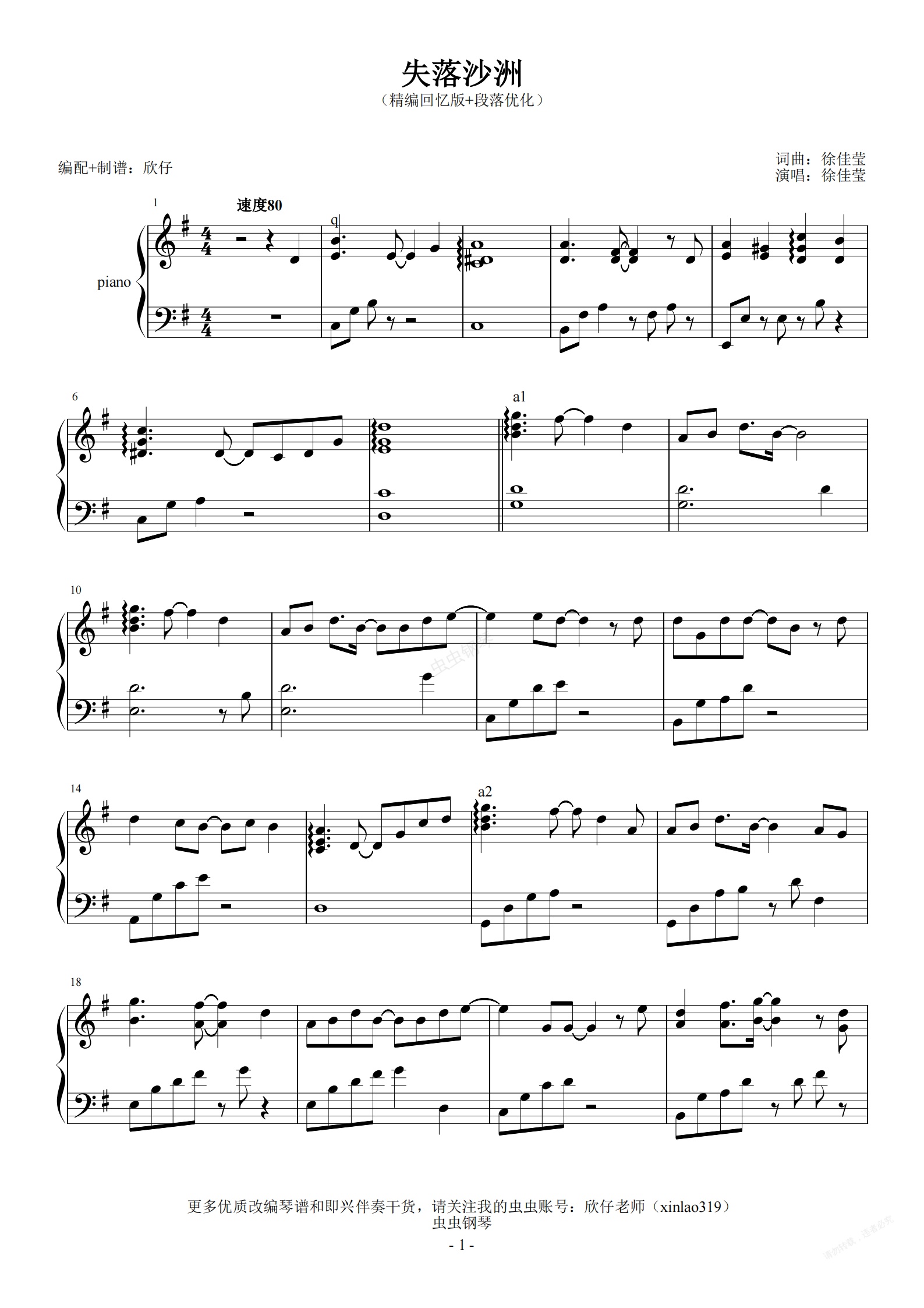钢琴谱:徐佳莹-G调《失落沙洲》(精编回忆版+段落优化)
