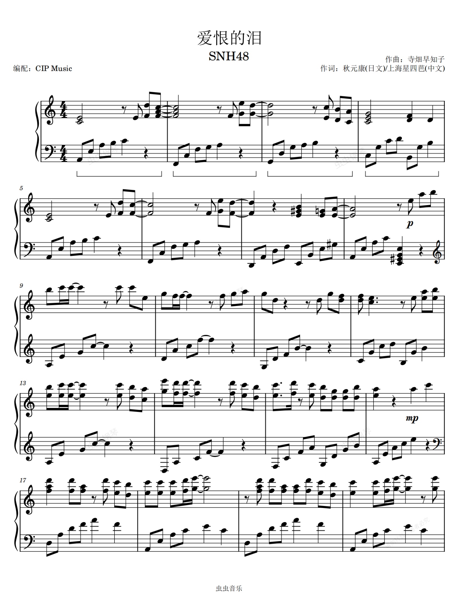 钢琴谱:《爱恨的泪》(てもでもの涙)