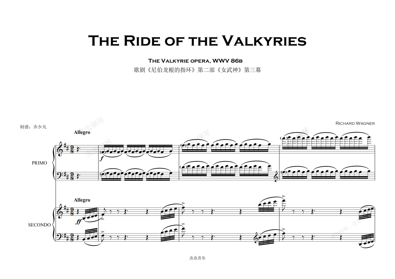 《女武神的飞行 The Ride of 》是德国著名作曲家理查德.瓦格纳(,,1813-1883)的杰作. 它描写九位英勇女神巡弋的情形,瓦格纳出神入化的利用雄壮的铜管,和繁复的弦乐装饰音,把女武神的英姿和空中战争的激烈逼真的描绘出来。瓦格納的艺术情怀是超时代的; 在上世纪他无缘见到飞机坦克, 但他气势磅薄的音乐, 却成为现代战争电影那些轰轰烈烈场面最好的配乐. 这里采用了战争电影"珍珠港"日本战机空袭的浴血场景来配搭这旋律, 其效果真是天衣无缝. 在德国音乐界,自贝多芬后,没有一个作曲家像瓦格纳那样具有宏伟的气魄和巨大的改革精神,他顽强地制定并实施自己的目标与计划,改革歌剧、让音樂與戲劇這兩種不同表現方式的藝術門類緊密地結合起來, 创出"乐剧"这崭新极致的表演型式,从而奠定了他在音乐史上的地位。