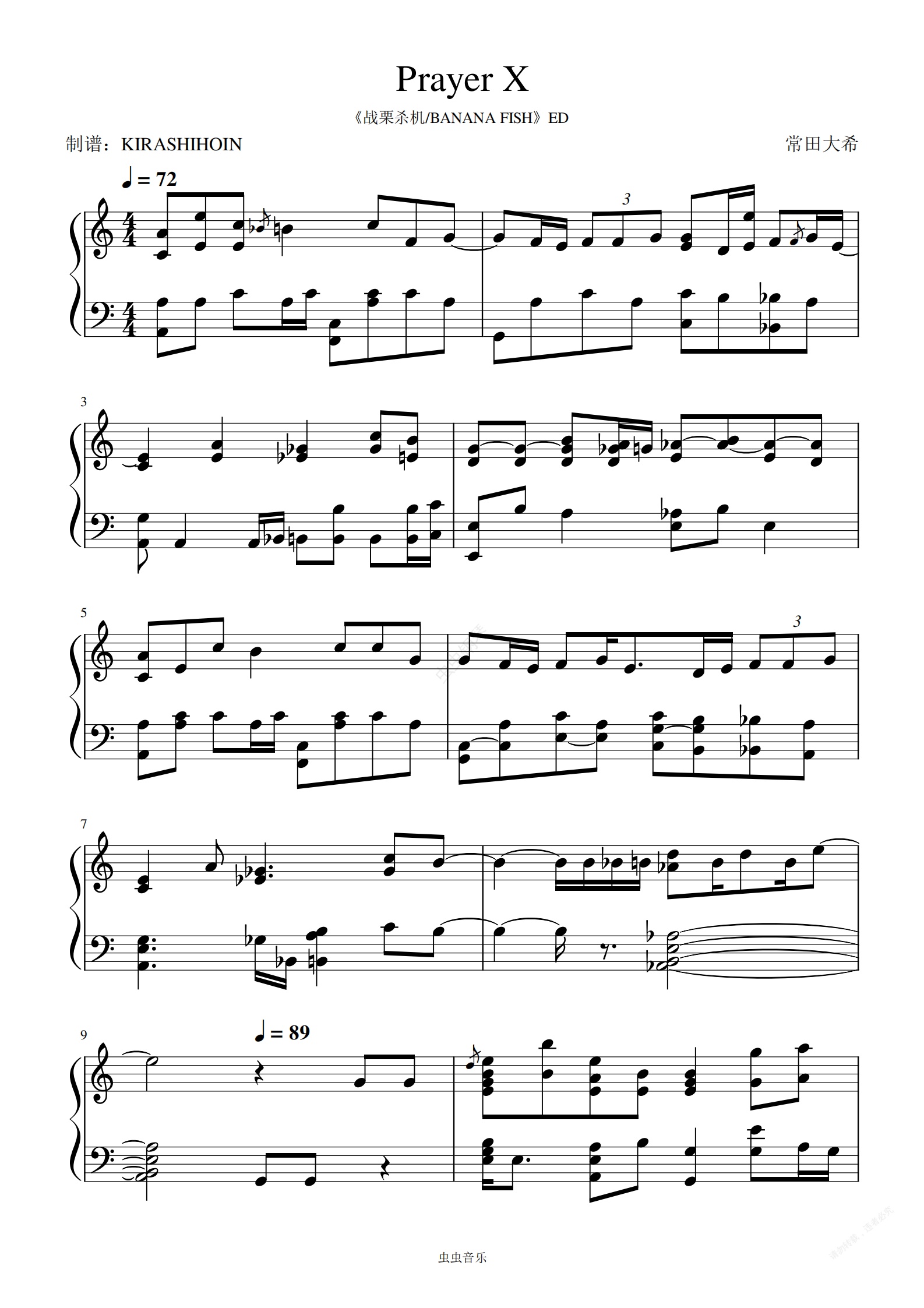 钢琴谱:Prayer X(《战栗杀机/BANANA FISH》ED)- King Gnu