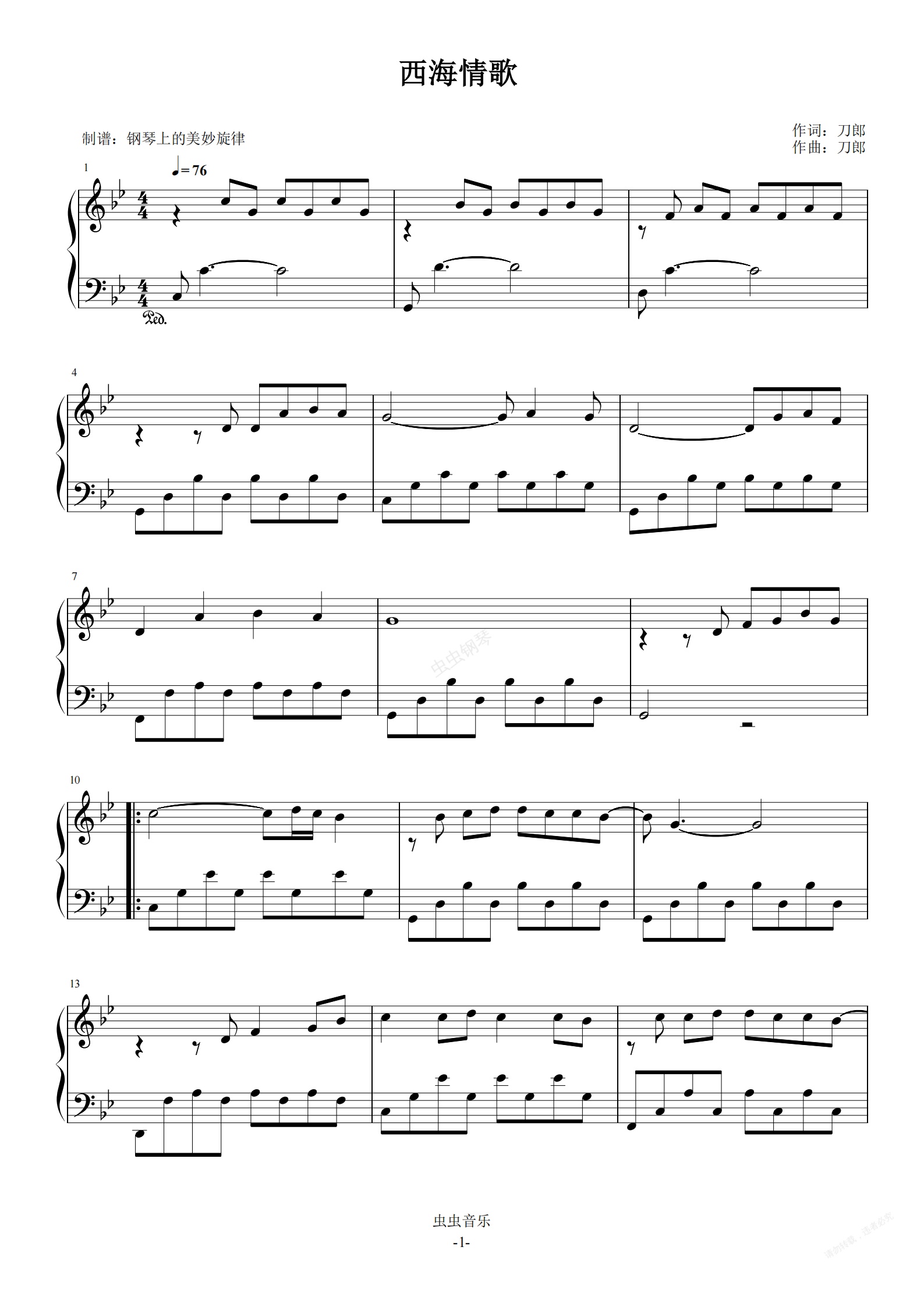 钢琴谱:西海情歌 刀郎 简易版 流行经典