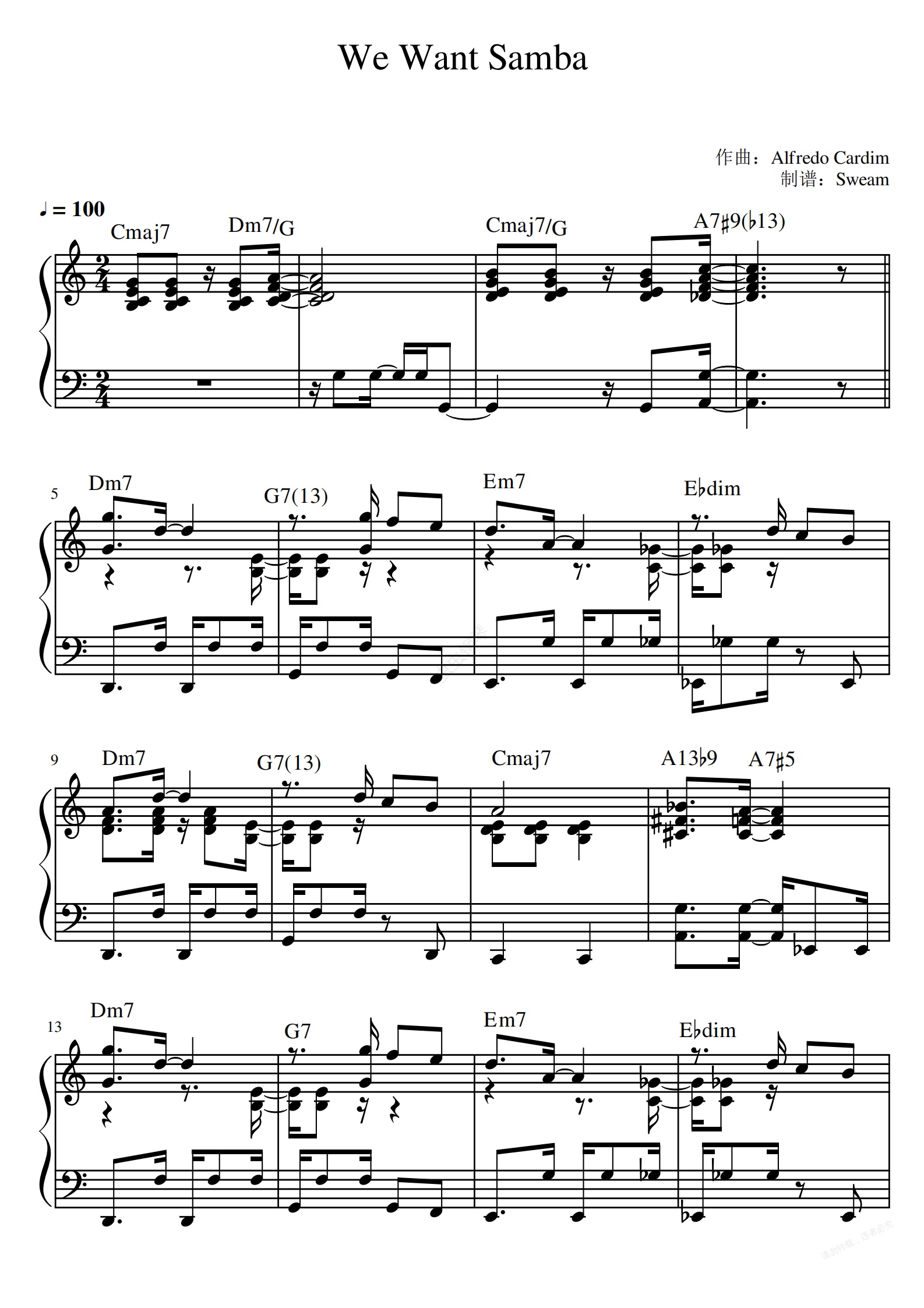 钢琴谱:We want Samba(清爽夏日巴西桑巴风带和弦)