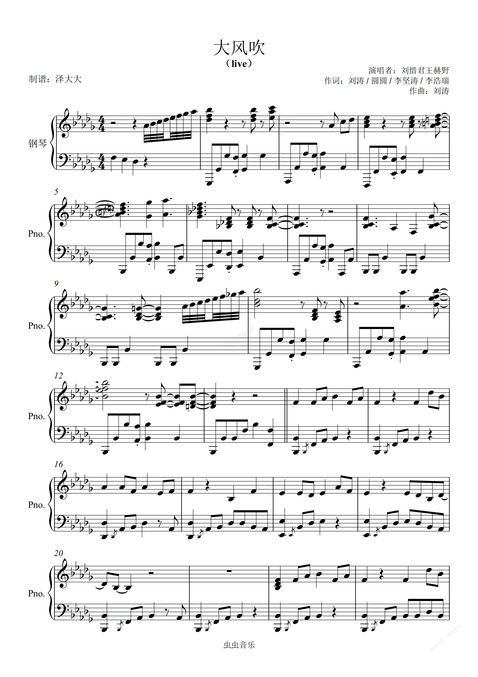 钢琴谱:大风吹【精编完美独奏】泽大大 刘惜君 王赫野