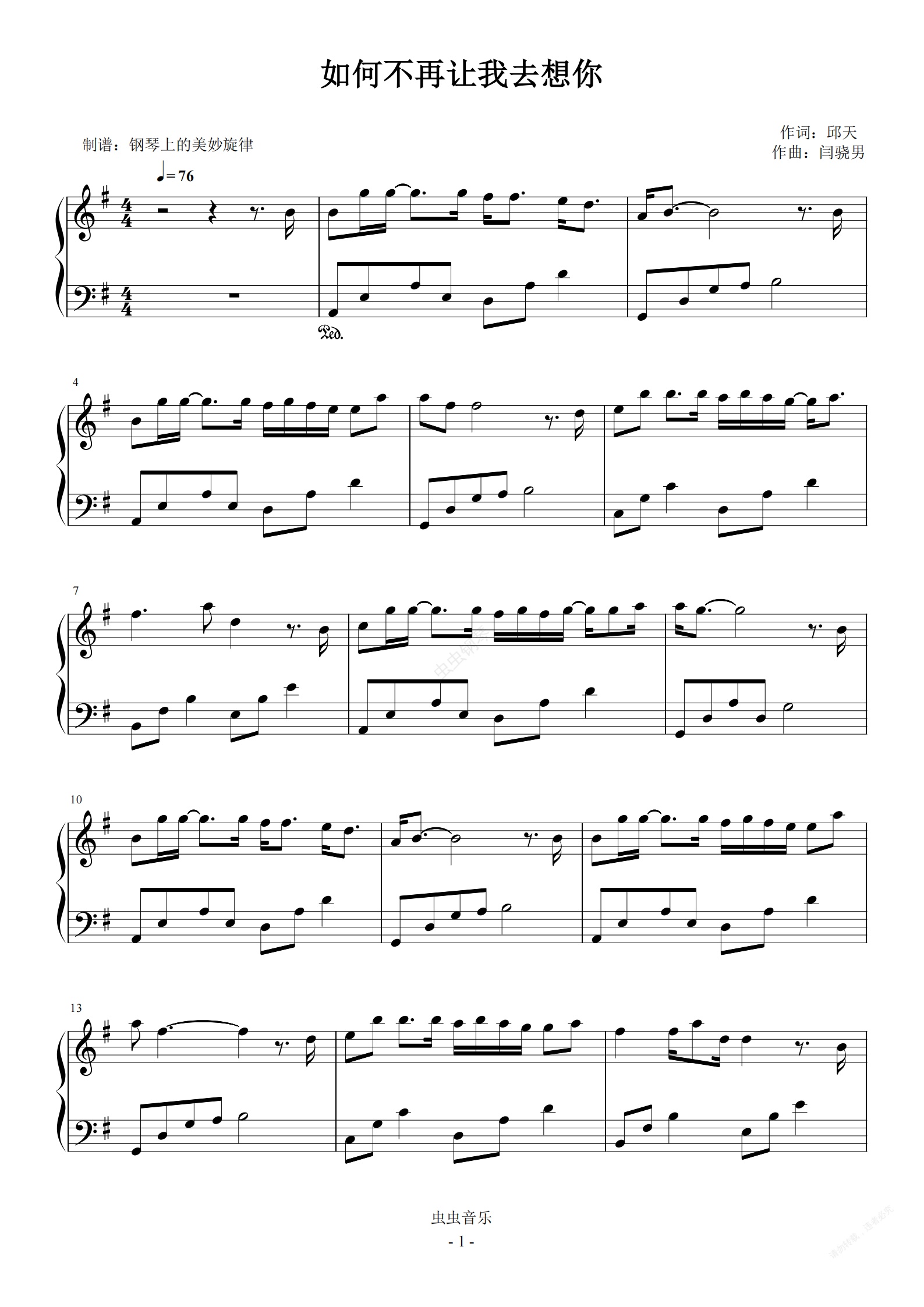 钢琴谱:如何不再让我去想你 简易版 井迪儿