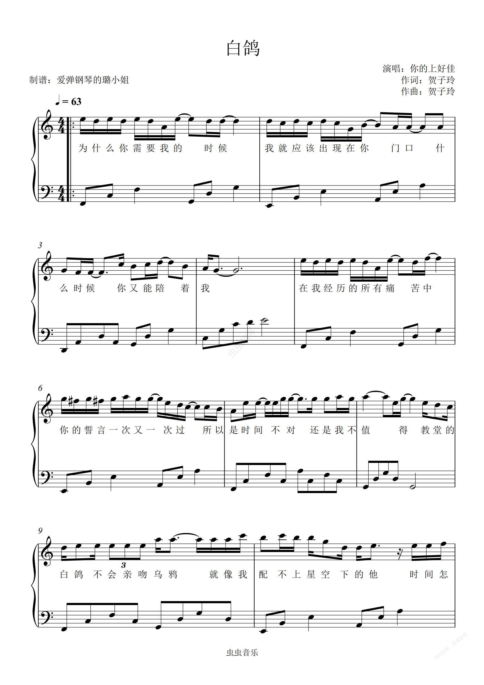 钢琴谱:白鸽 - 你的上好佳 - 抖音热歌 - C调简单易上手 - 附带歌词