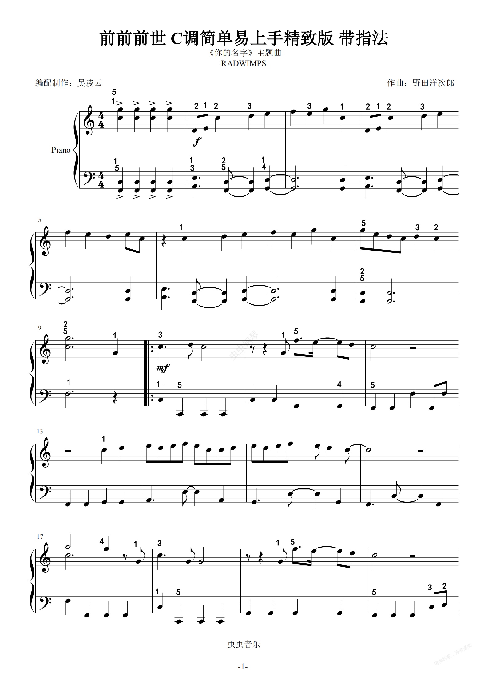 钢琴谱:前前前世 C调简单易上手精致版带指法 RADWIMPS《你的名字》主题曲 吴凌云钢琴编配简易版 好听且易上手