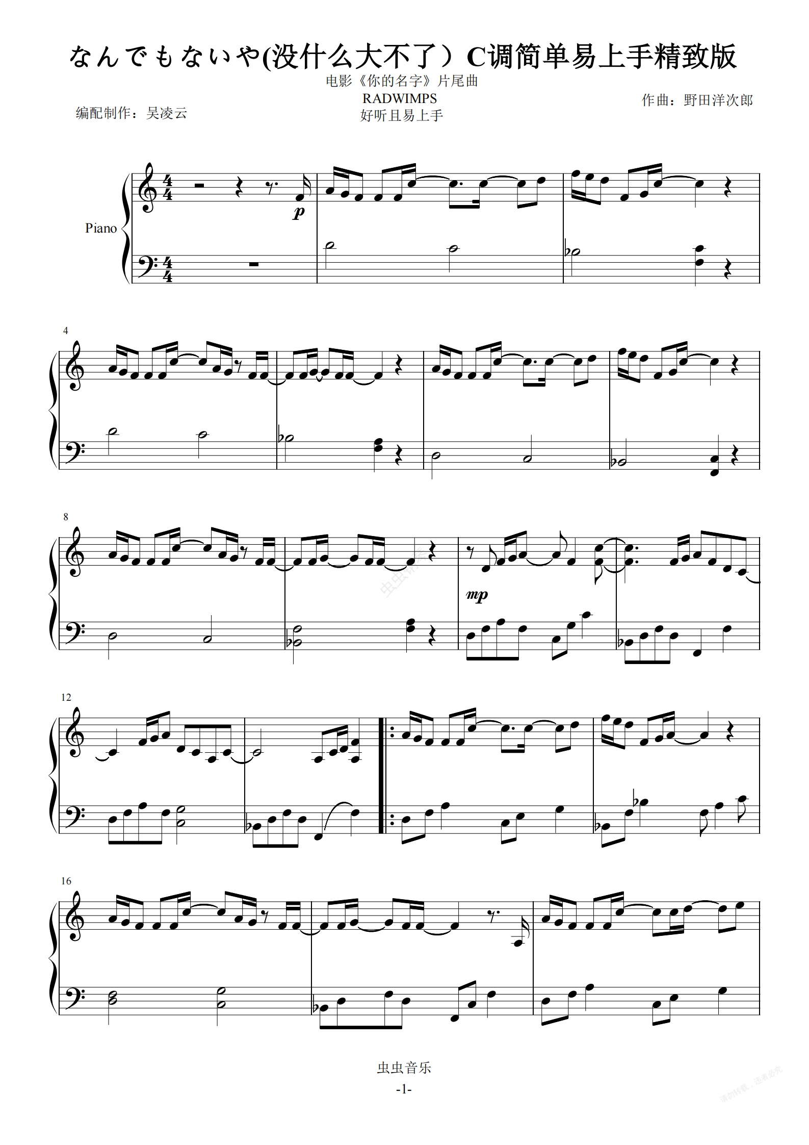 钢琴谱:なんでもないや(没什么大不了)电影《你的名字》片尾曲 C调简单易上手精致版 吴凌云编配钢琴钢琴简易版