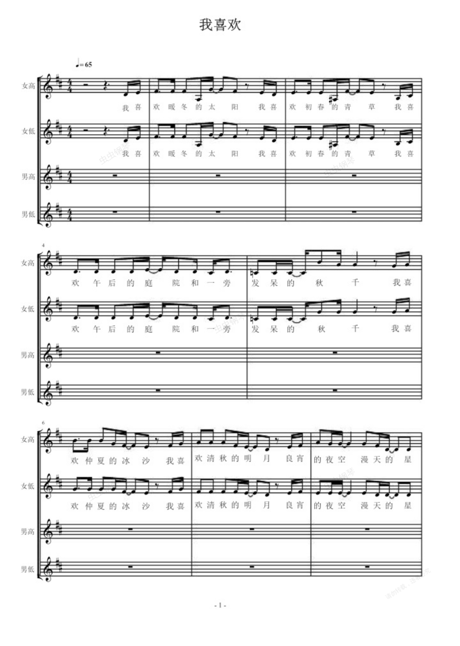 钢琴谱:我喜欢(无伴奏,只有四声部合唱)