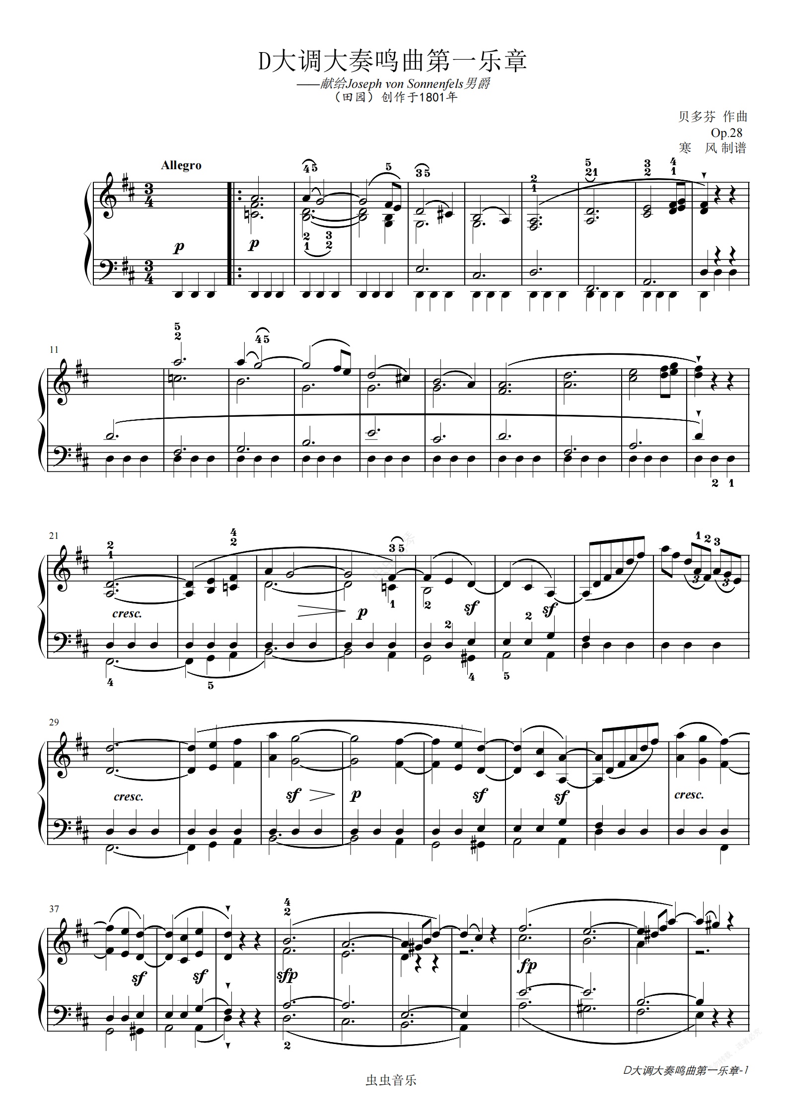钢琴谱:贝多芬-D大调田园奏鸣曲第一乐章
