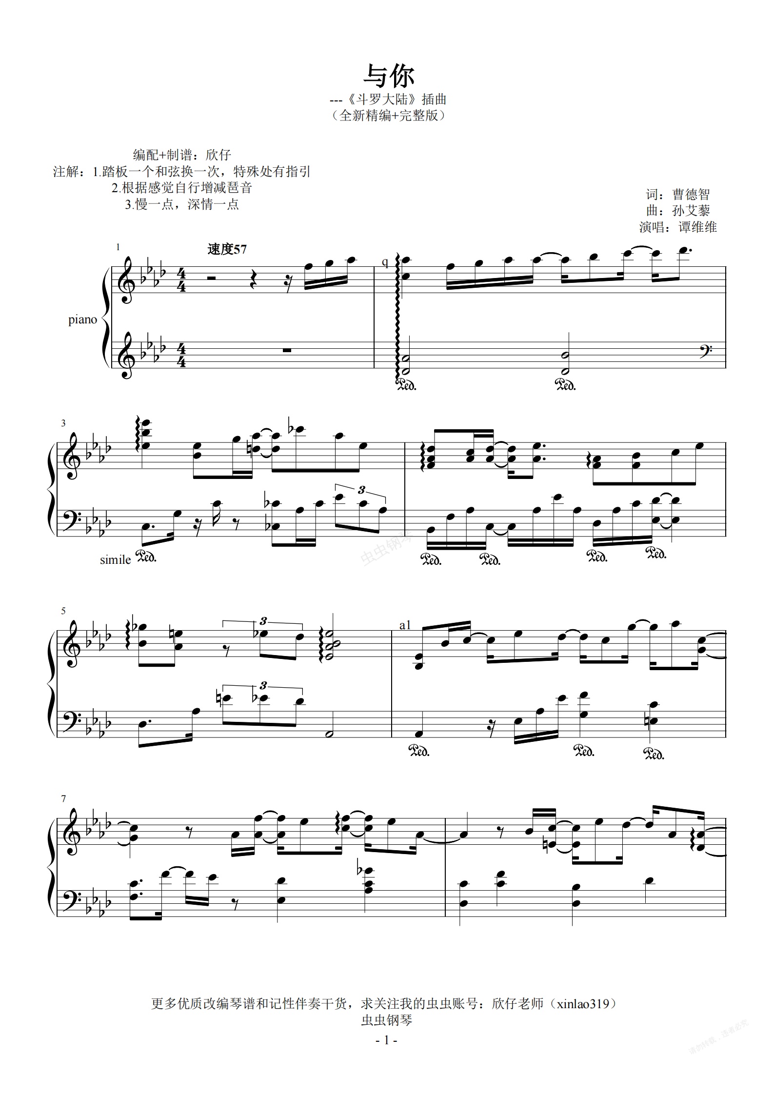 钢琴谱:谭维维-降A《与你》(《斗罗大陆》插曲,全新精编+完整版)