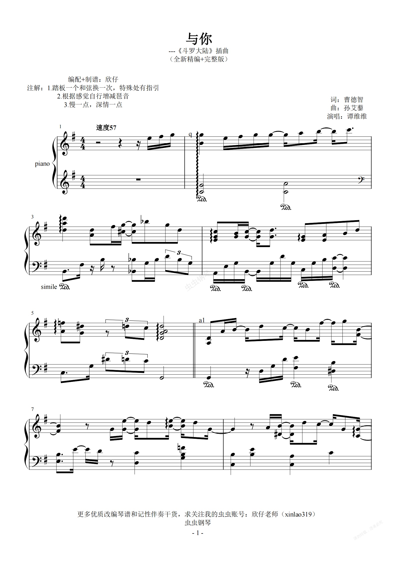 钢琴谱:谭维维-G调《与你》(《斗罗大陆》插曲,全新精编+完整版)