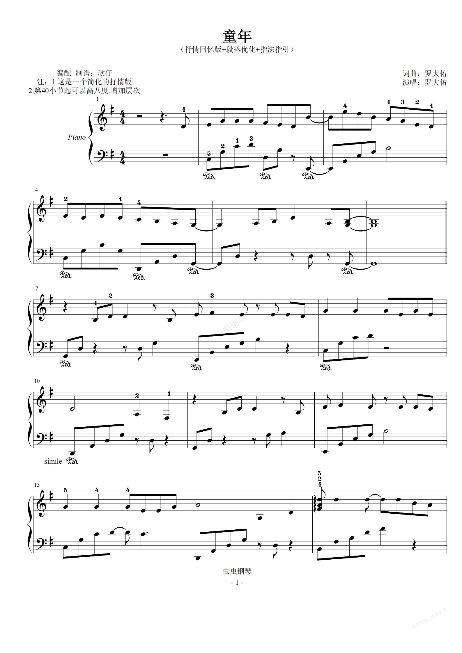 钢琴谱:G调-《童年》(抒情回忆版+段落优化+指法指引)
