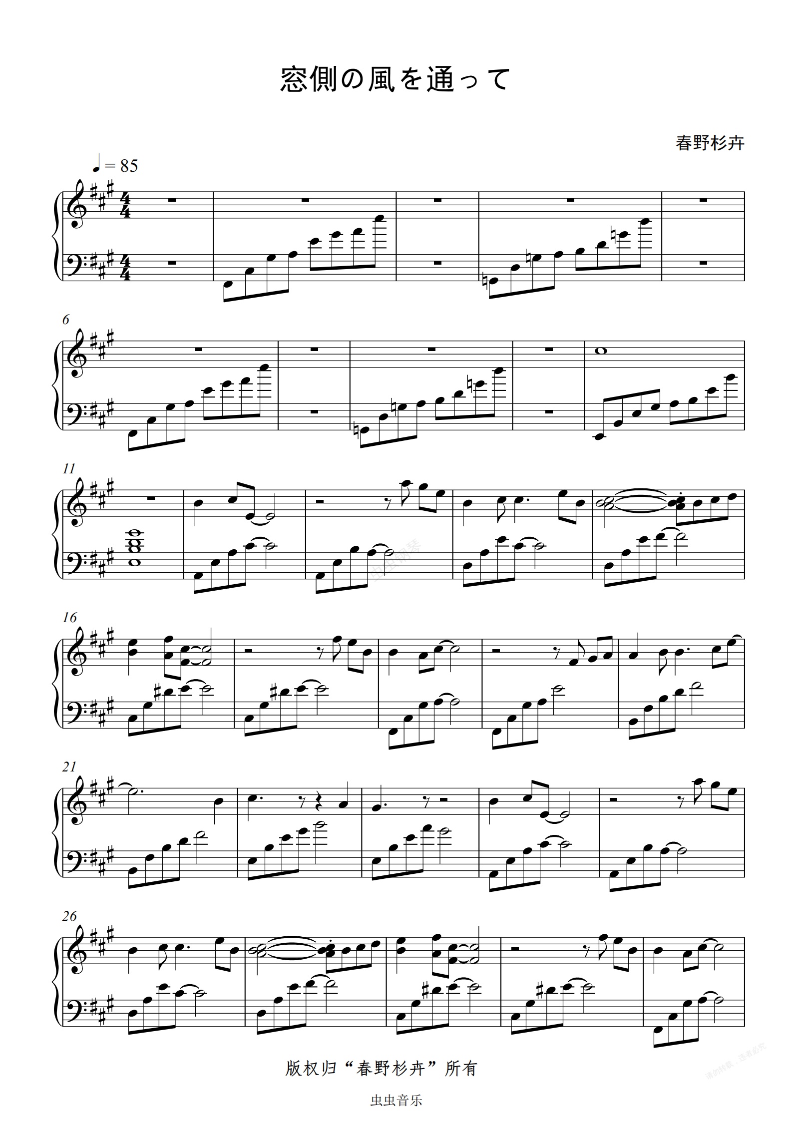 钢琴谱:窓側の風を通って/透过窗边的风