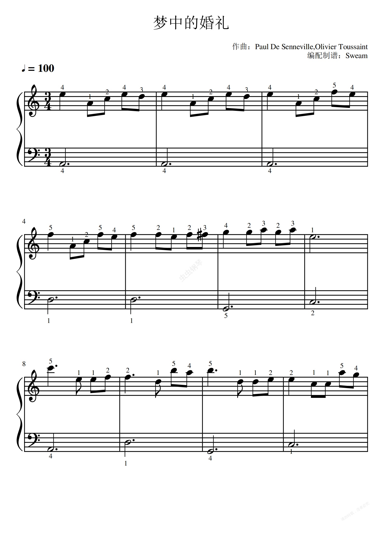 钢琴谱:梦中的婚礼(幼儿入门新手上路超简版带指法)