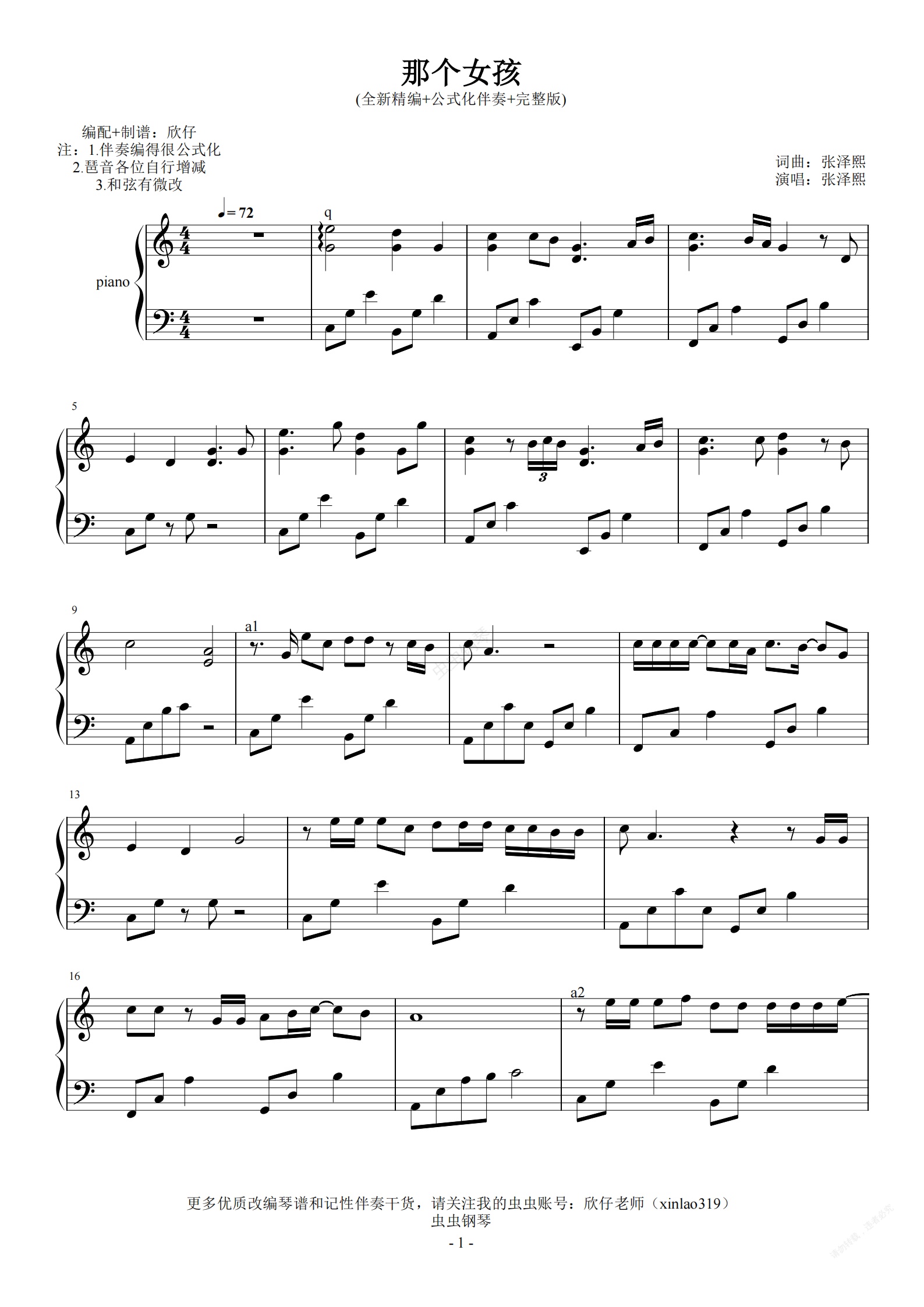 钢琴谱:张泽熙-C《那个女孩》(全新精编+公式化伴奏+完整版)