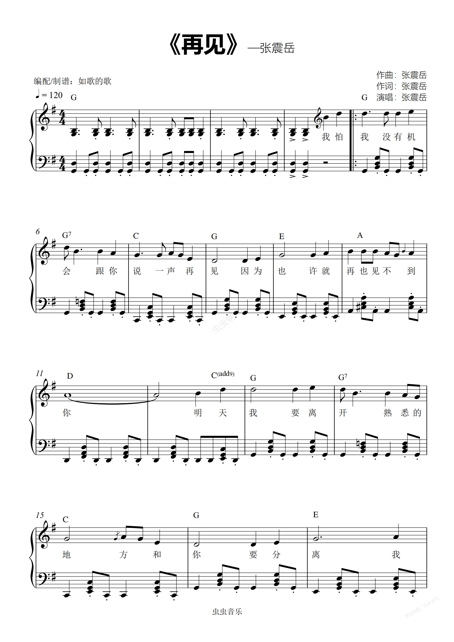 钢琴谱:《再见》G调-张震岳-毕业专用,离别专供