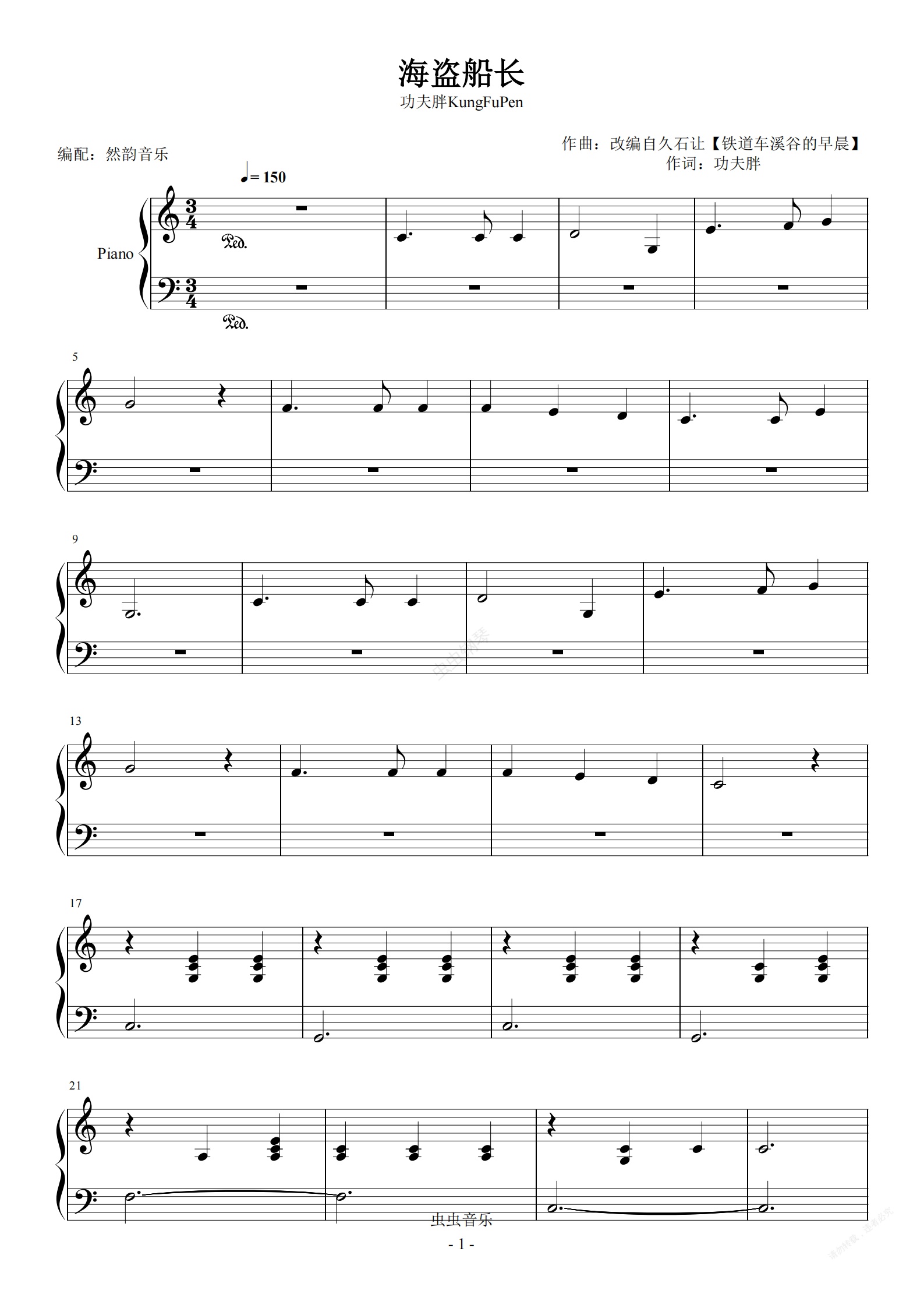 钢琴谱:海盗船长-功夫胖KungFuPen 简单好听版