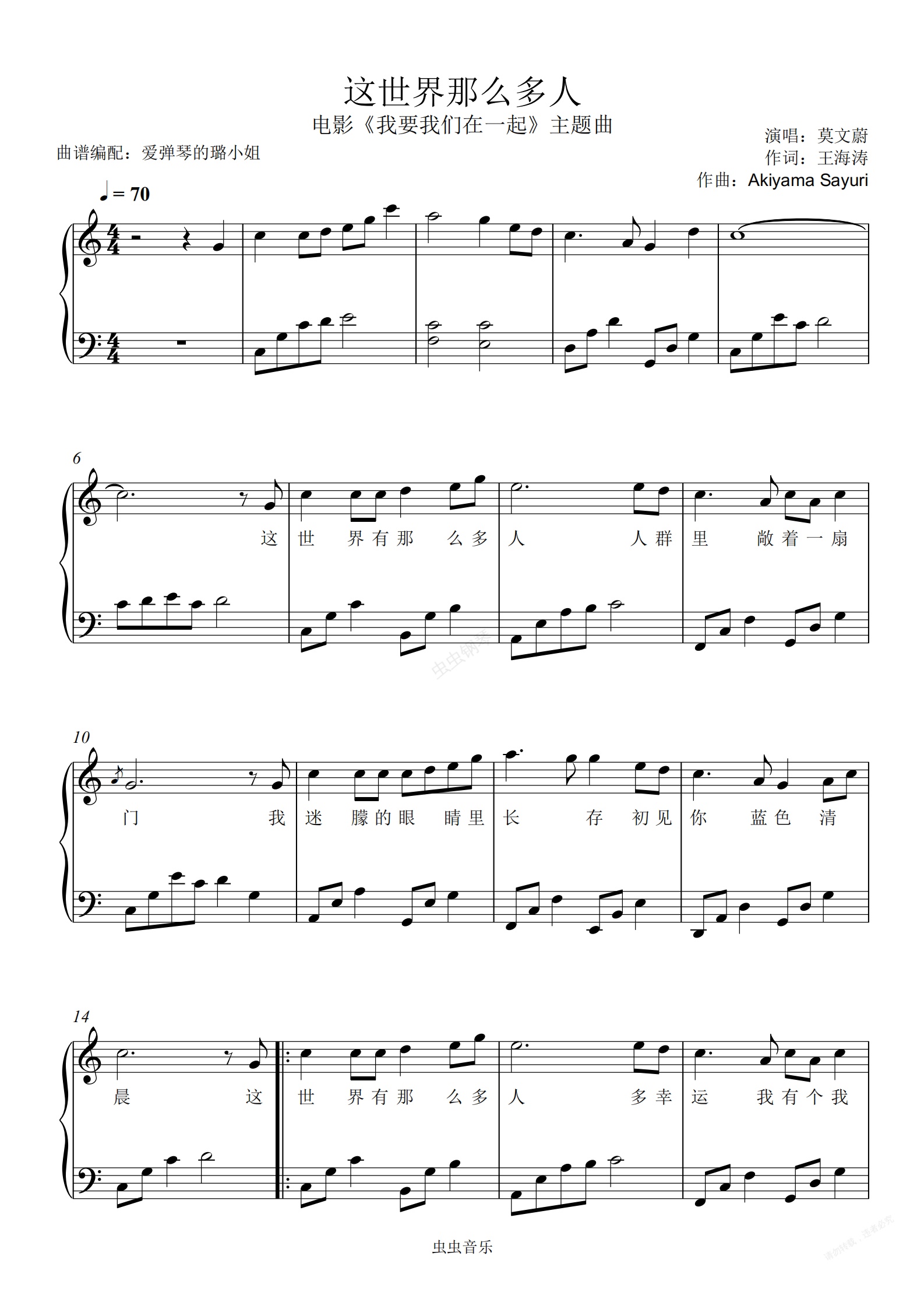钢琴谱:这世界那么多人 - C调简易版 - 《我要我们在一起》主题曲 - 附歌词