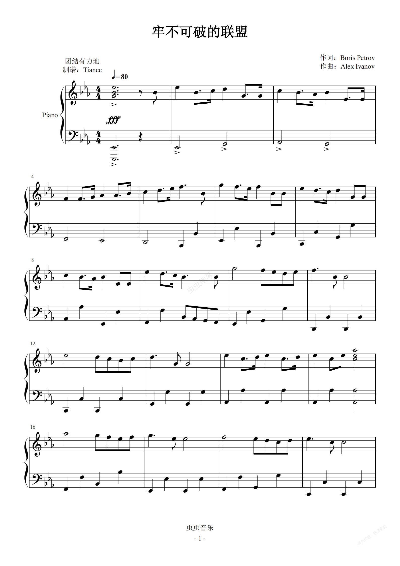 钢琴谱:《牢不可破的联盟》苏联国歌,拜厄难度