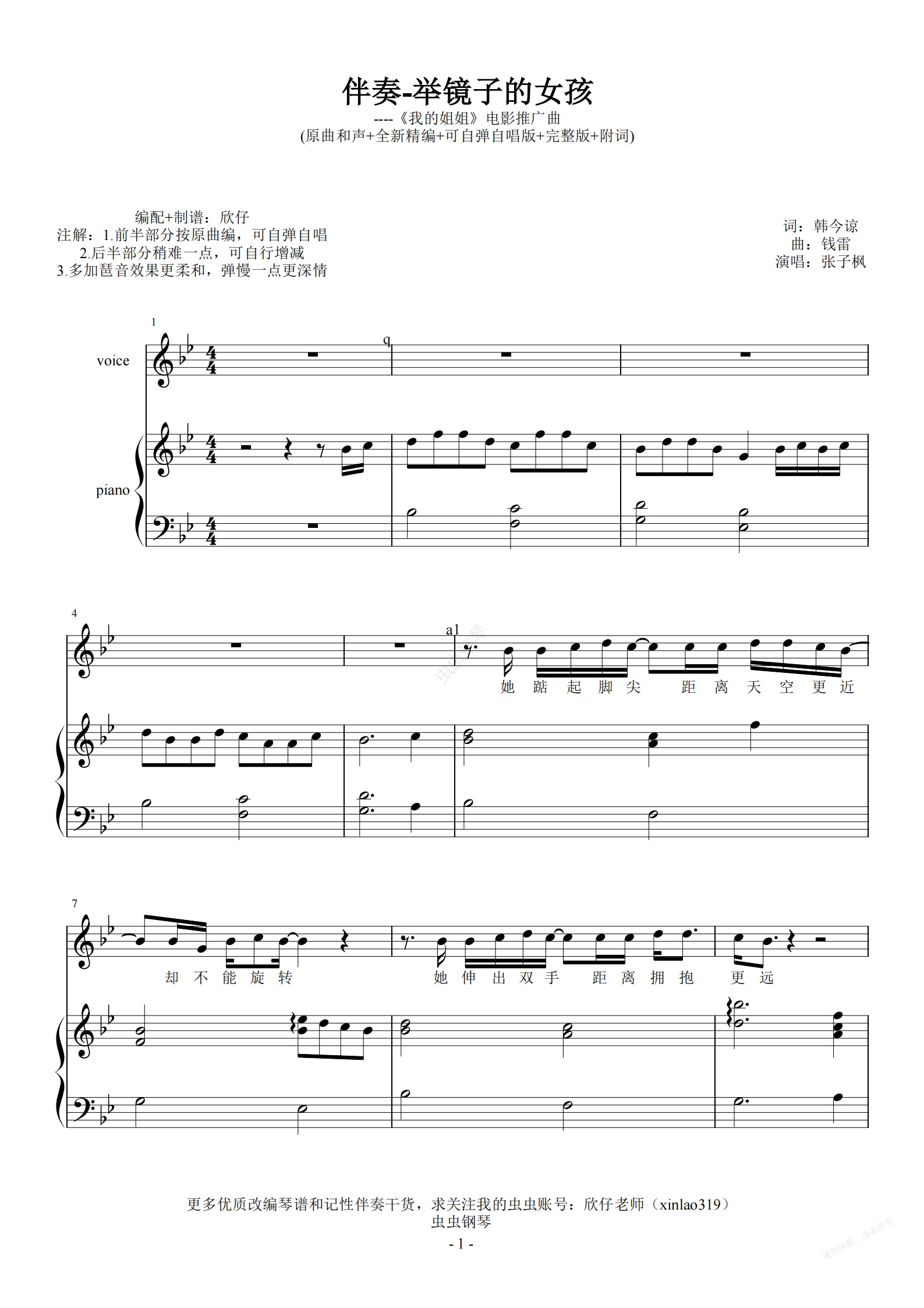 钢琴谱:(伴)张子枫-降B《举镜子的女孩》(可自弹自唱+完整版+附词)