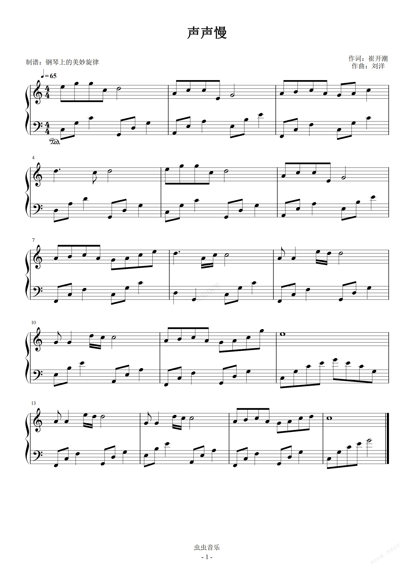 钢琴谱:声声慢 C调简易版