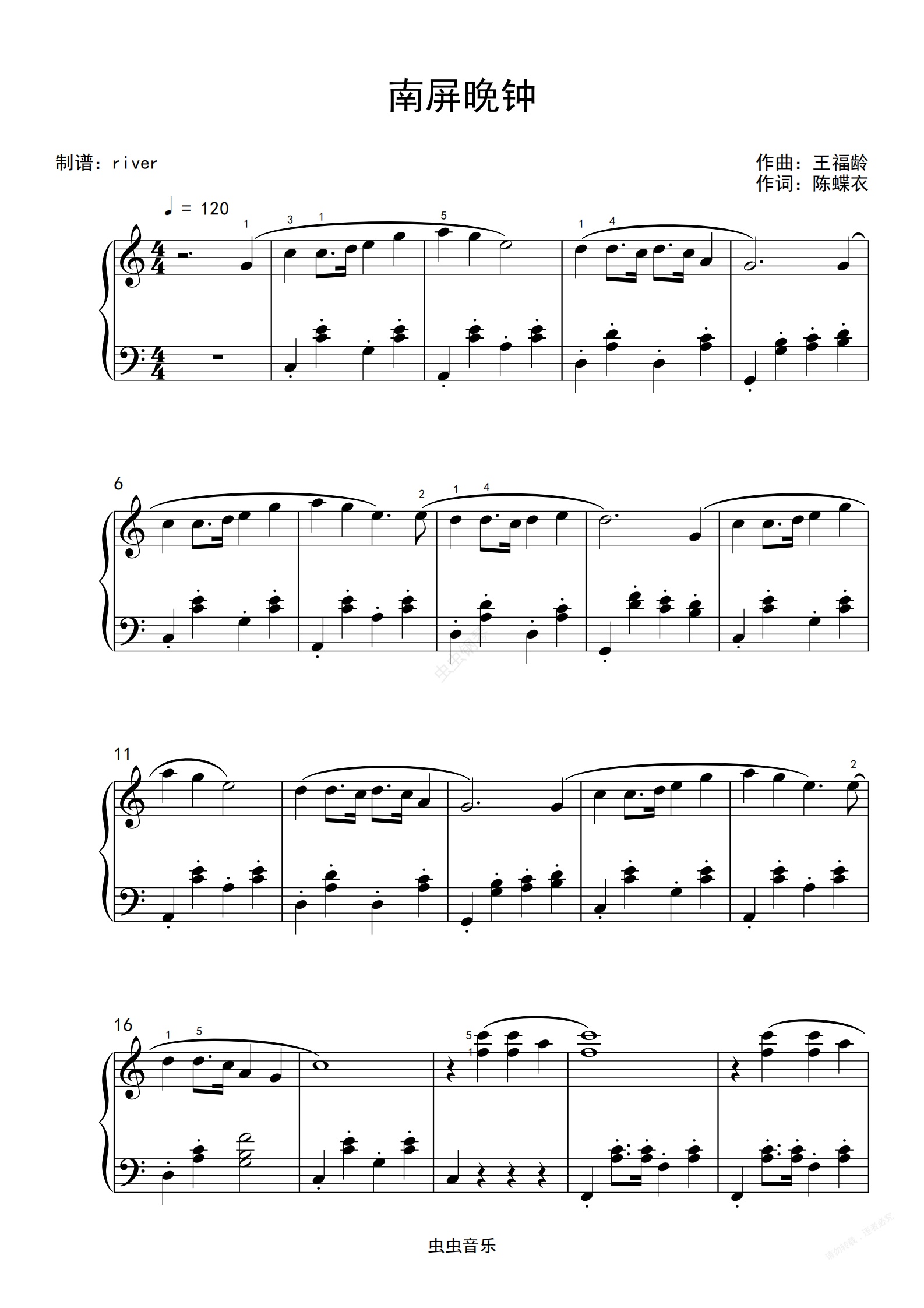 钢琴谱:南屏晚钟 c调完美和声+指法+公式化左手