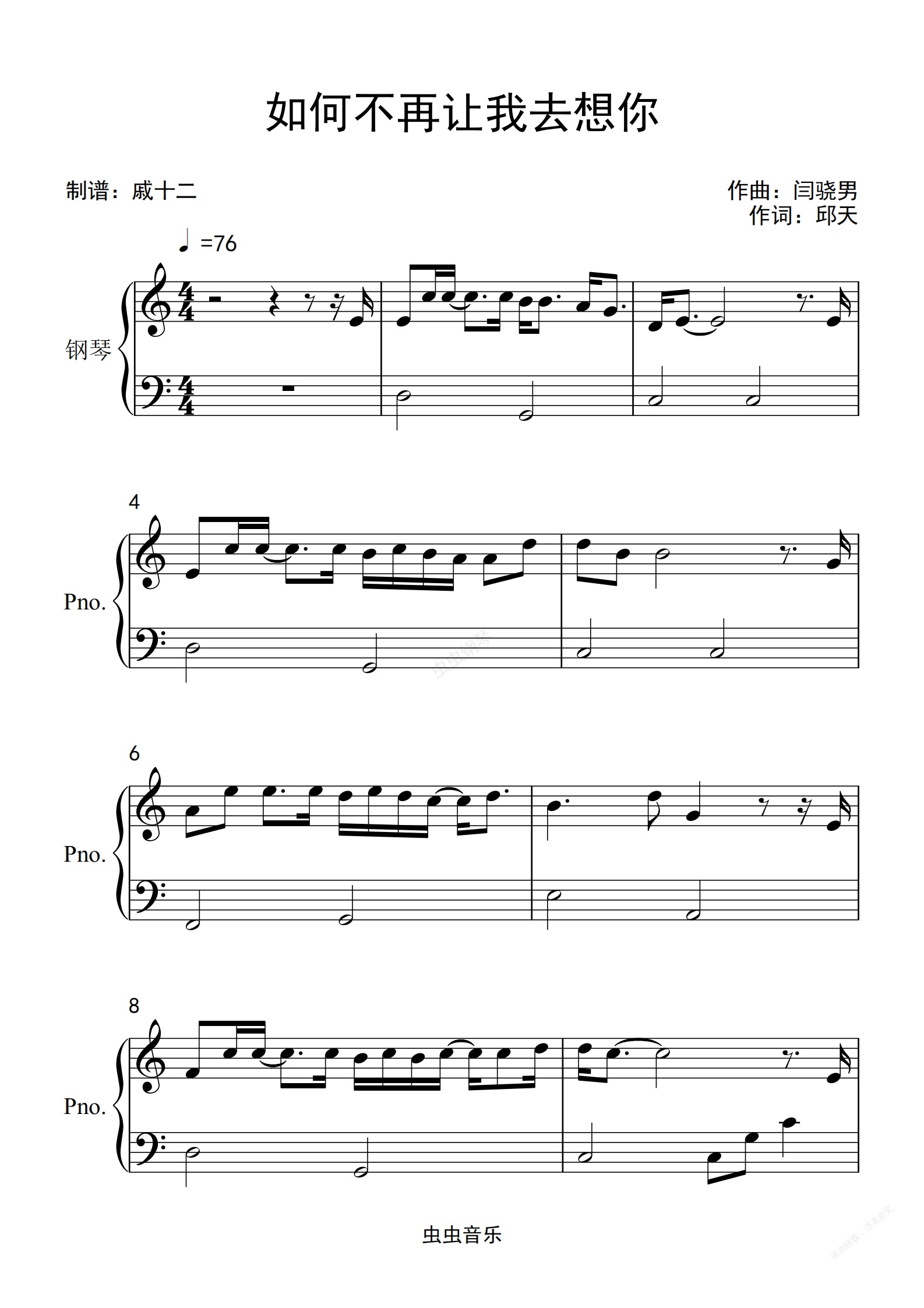 钢琴谱:如何不再让我去想你-C调简单版