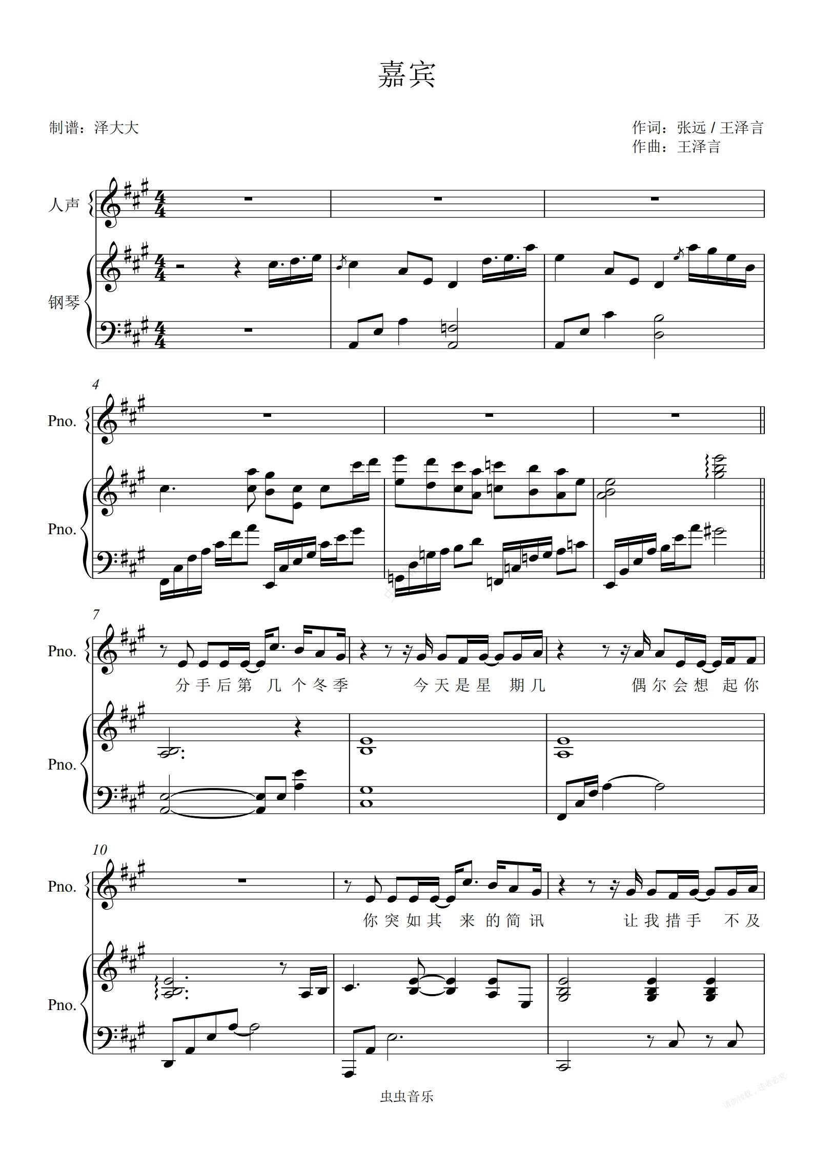 钢琴谱:嘉宾【男生版走心弹唱附词】泽大大 张远