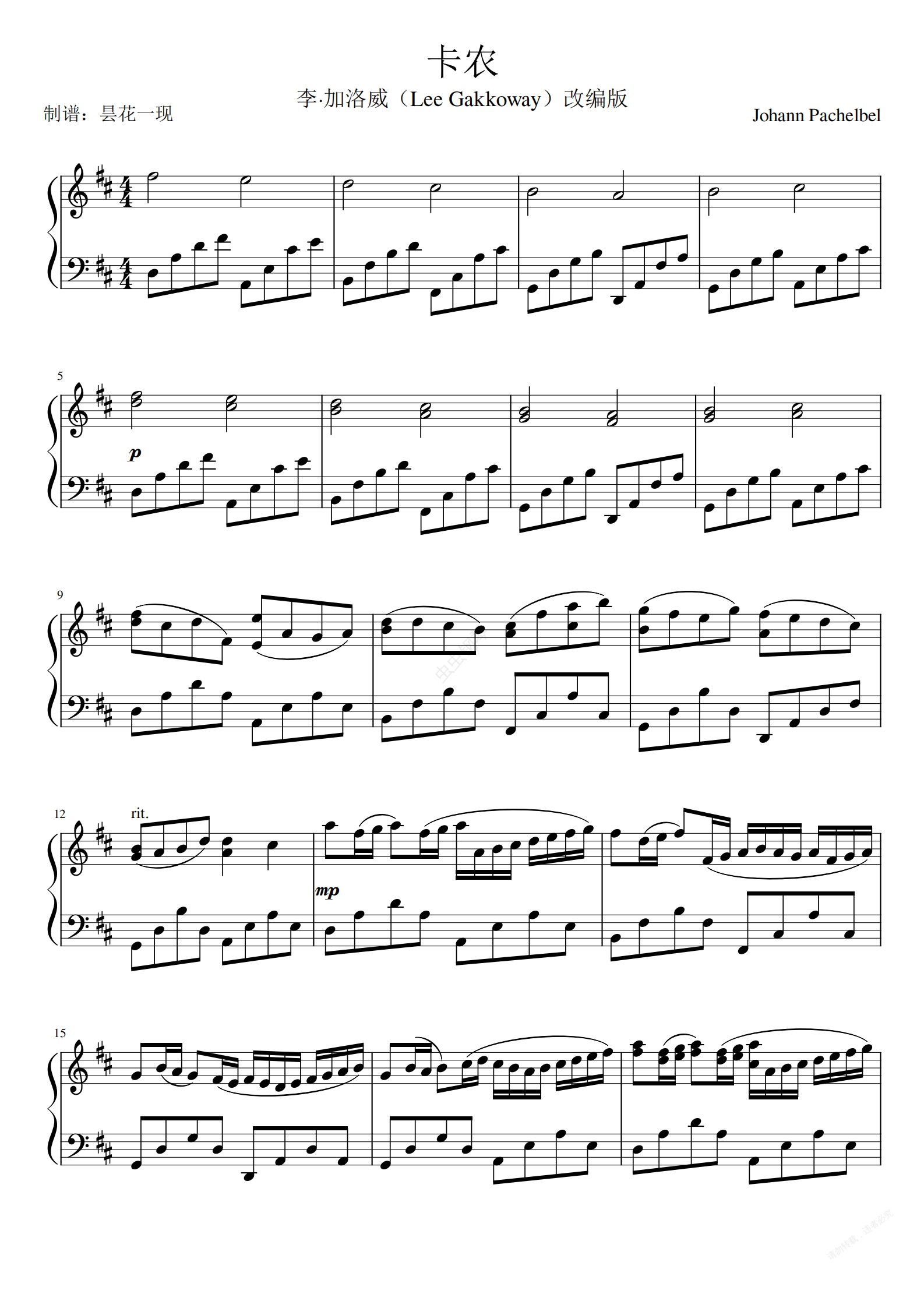 钢琴谱:卡农-李·加洛威版