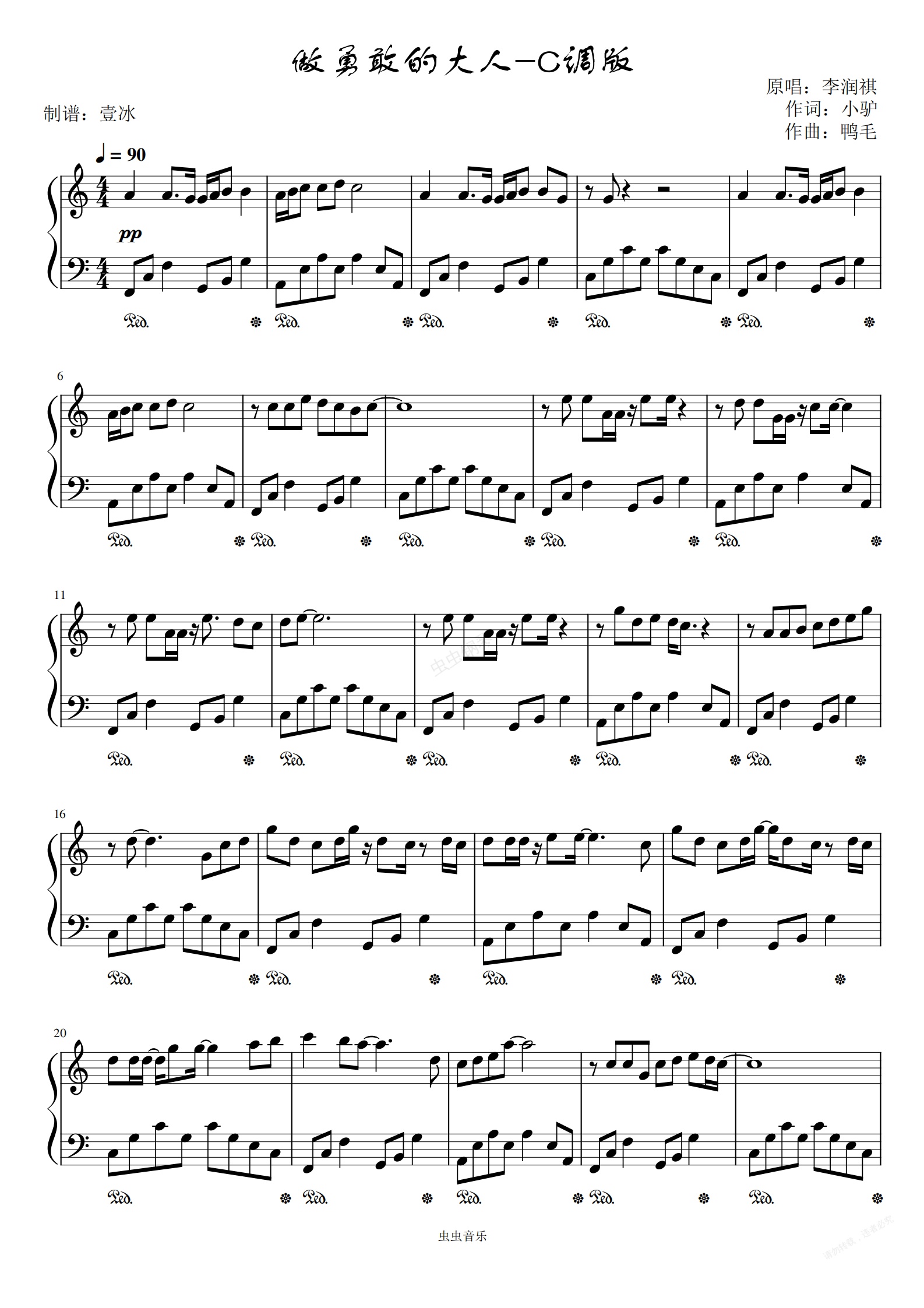钢琴谱:做勇敢的大人//李润祺-C调简单易上手