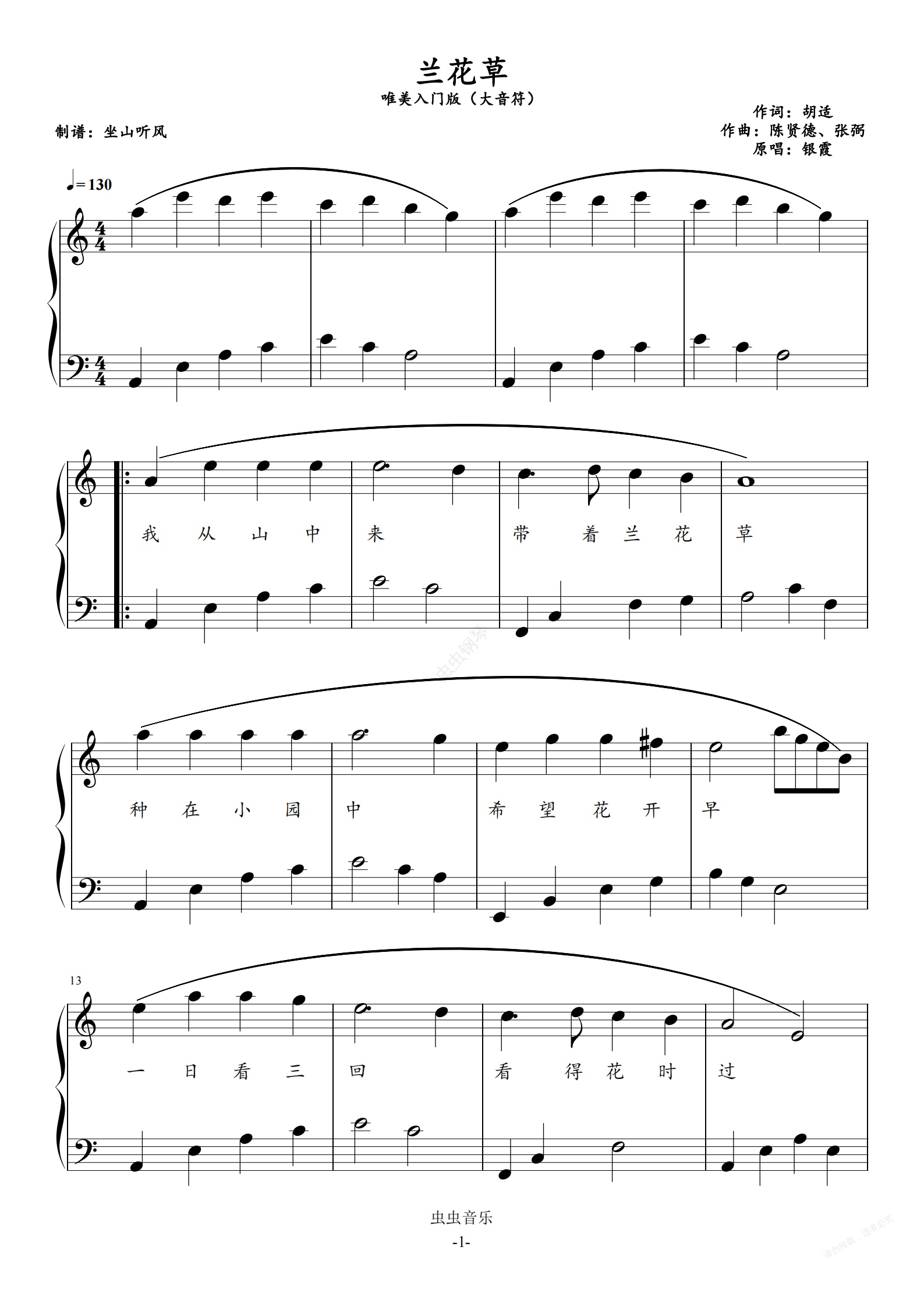 钢琴谱:兰花草—— 唯美入门版(大音符)