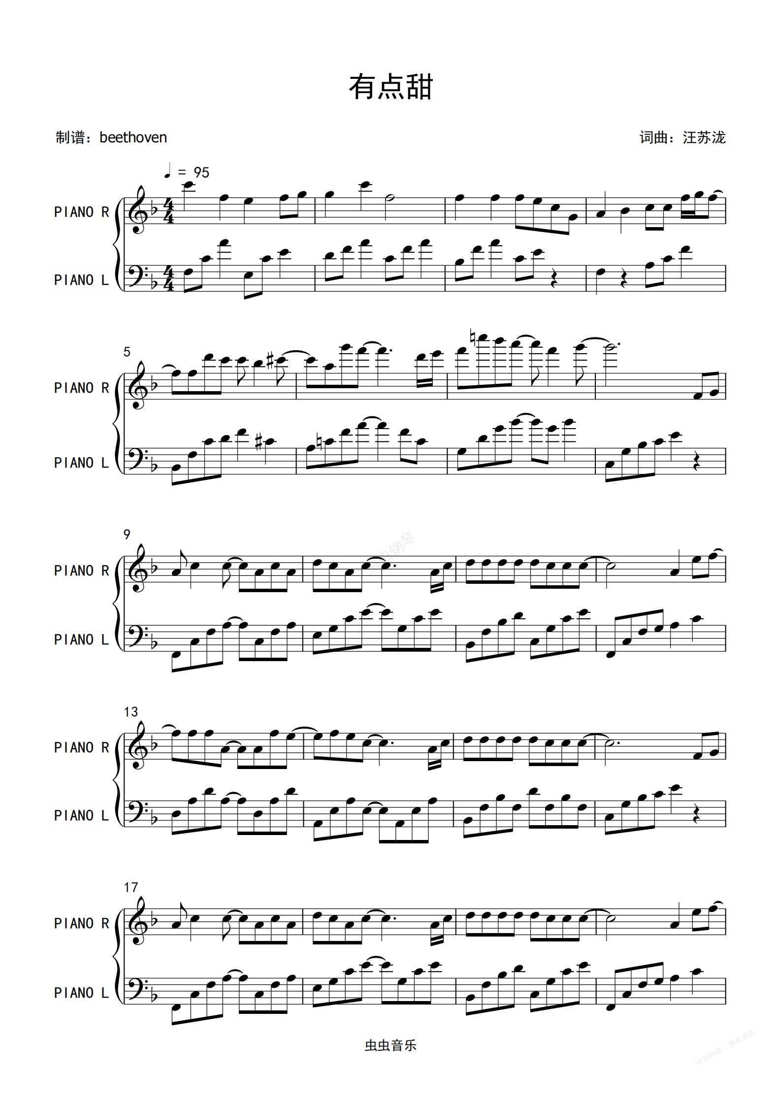 钢琴谱:有点甜-汪苏泷-钢琴solo、原版