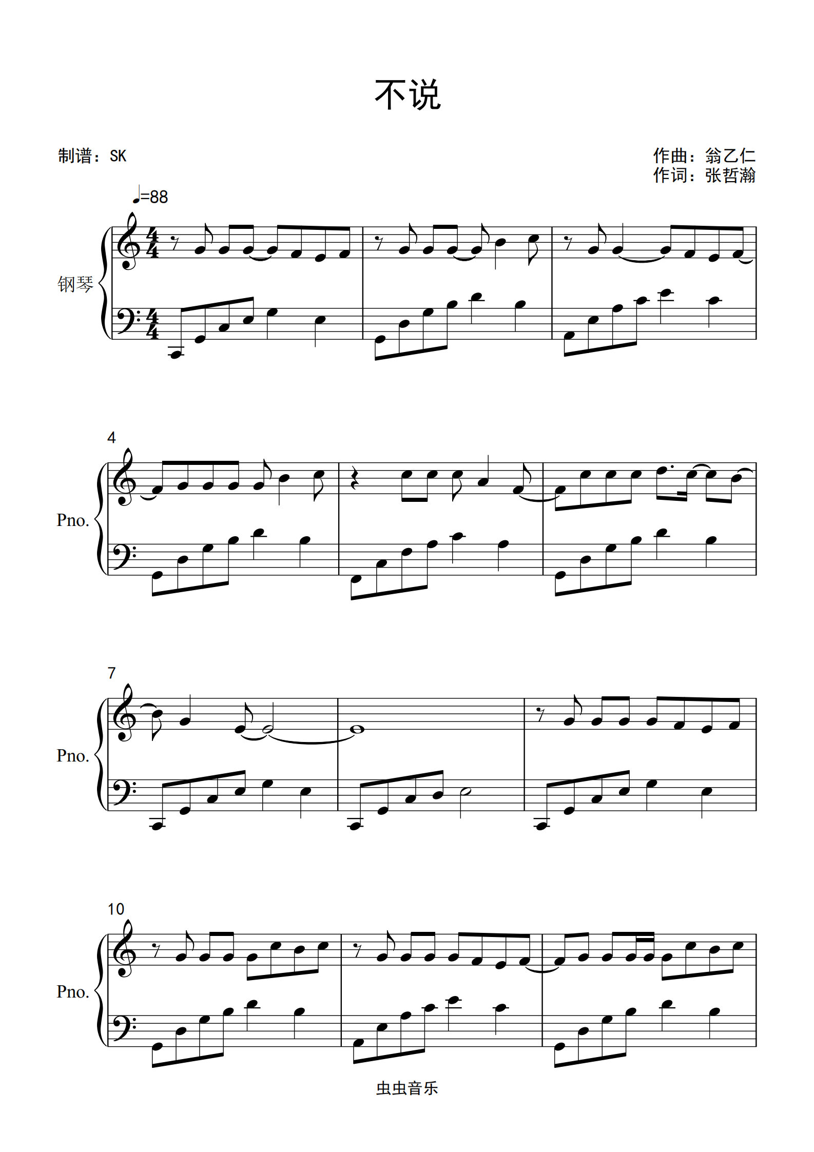 钢琴谱:张哲瀚《不说》入门C调抒情版
