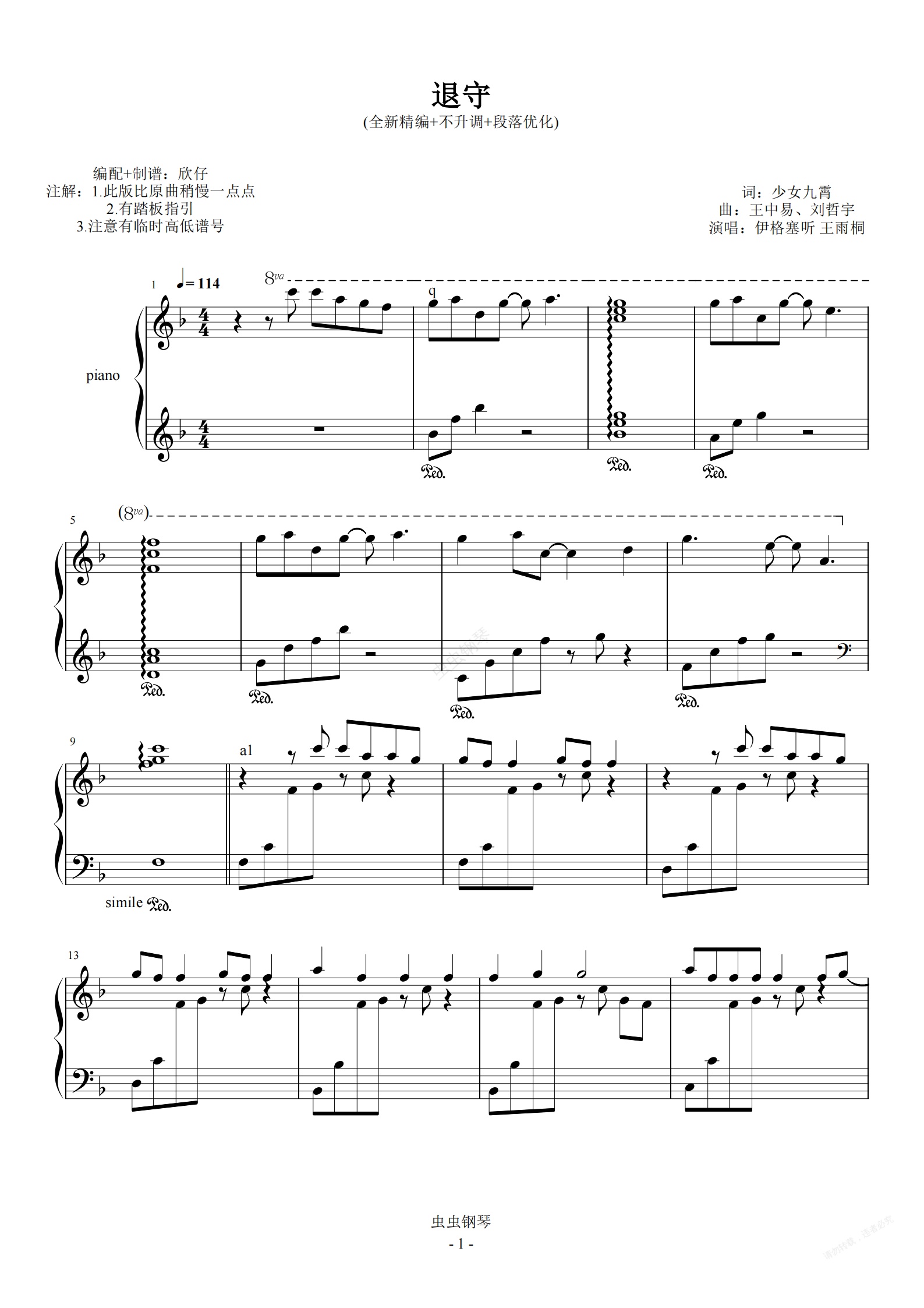 钢琴谱:王雨桐-F《退守》(全新精编+不升调+段落优化)